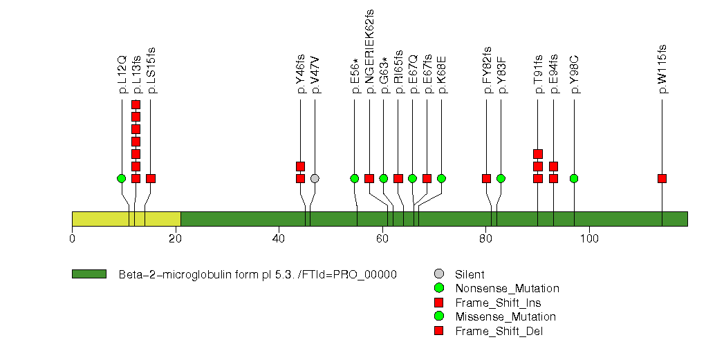 Figure S11. This figure depicts the distribution of mutations and mutation types across the B2M significant gene.