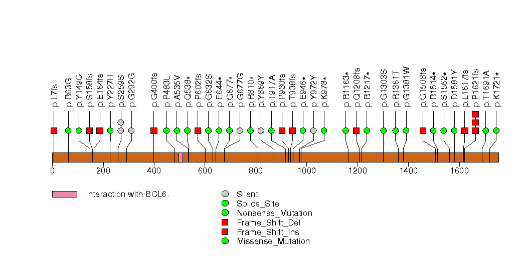 Figure S30. This figure depicts the distribution of mutations and mutation types across the BCOR significant gene.