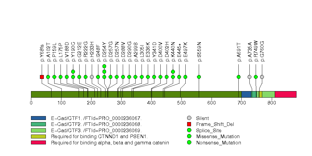 Figure S29. This figure depicts the distribution of mutations and mutation types across the CDH1 significant gene.