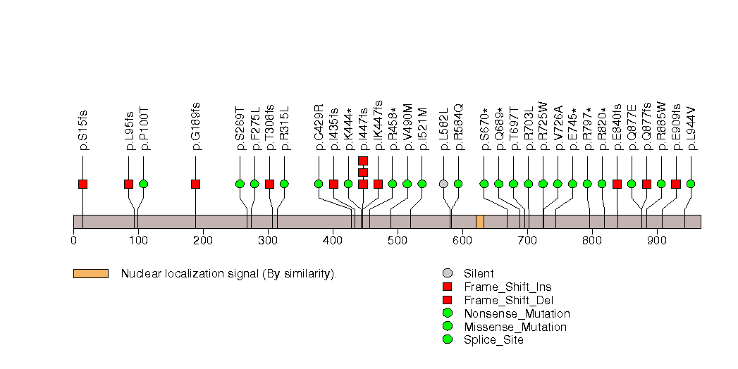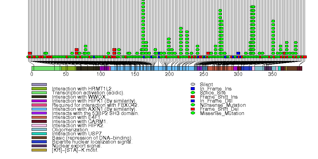 Figure S1. This figure depicts the distribution of mutations and mutation types across the TP53 significant gene.