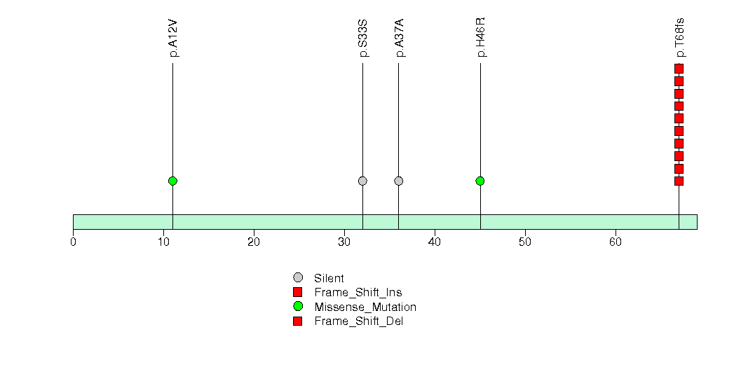 Figure S14. This figure depicts the distribution of mutations and mutation types across the GNG12 significant gene.