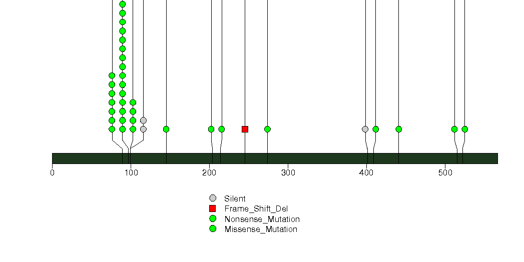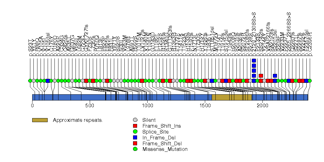 Figure S20. This figure depicts the distribution of mutations and mutation types across the MUC6 significant gene.
