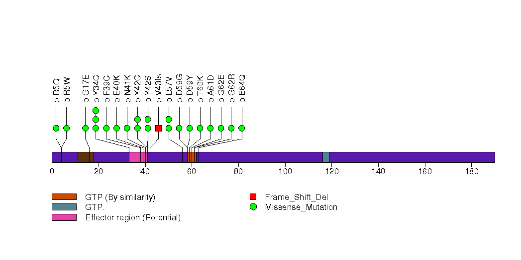 Figure S10. This figure depicts the distribution of mutations and mutation types across the RHOA significant gene.