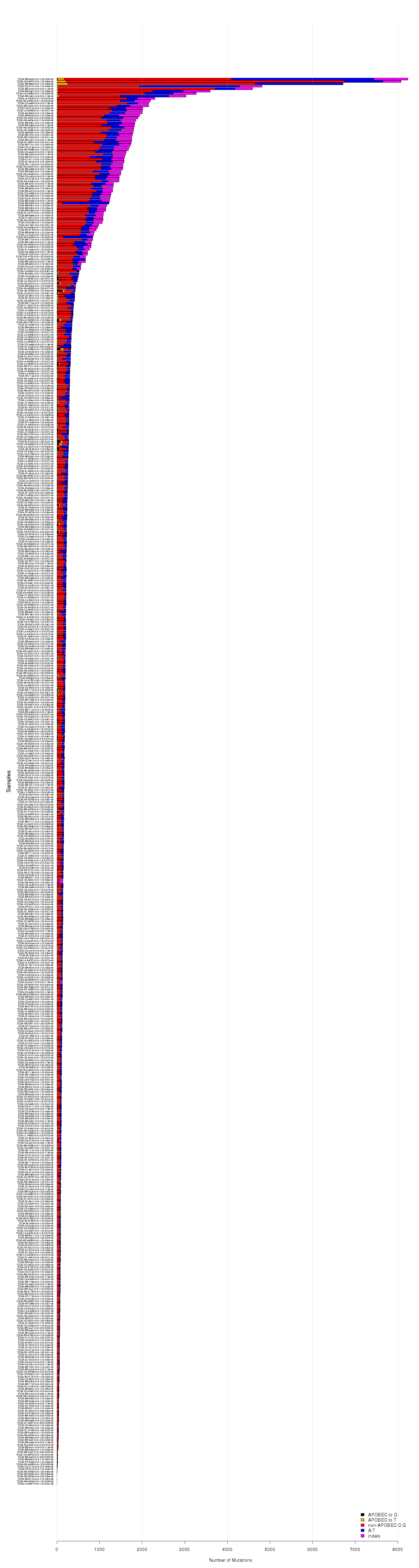Figure 4. Get High-res Image Numbers of APOBEC and non-APOBEC mutations (X-axis) in each sample (Y-axis). All values are calculated based on the values in the columns “indels”, “substitutions”, and columns containing individual substitution types in the “*_sorted_sum_all_fisher_Pcorr.txt” file. “APOBEC to G” – number of tCw→tGw mutations; “APOBEC to T” – number of tCw→tTw mutations; “non-APOBEC C:G” – number of mutations in C:G base pairs not conforming to the APOBEC signature (= total of tCw→tAw plus all mutations in C not occurring in the tCw motif); “A:T” –- all mutations in A:T base pairs; “indels” – all indels. All counts include complementary mutations. Samples are ordered by total mutation counts in the descending order. Since only base substitutions are shown, bars with excessive numbers of non-substitution mutations may be shorter than the two flanking bars.
