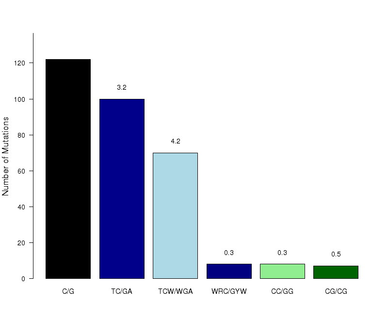 Figure 8. Get High-res Image The number of mutations categorized into three possible types of substitutions at the tCw motif (complementary mutations included) within C- or G-coordinated clusters. Numbers are calculated using the “Totals” row in the corresponding columns of the “*_sorted_sum_G_C_clusters.txt” file. Mutations caused by cytidine deamination in stretches of ssDNA caused by APOBEC mutagenesis are expected to be predominantly C-->T or C-->G with very few C-->A. Base substitution categories are shown within TCW context.