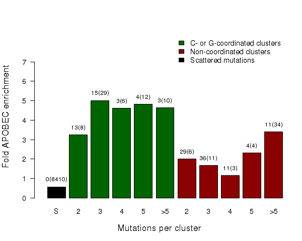 Fold enrichment of the APOBEC mutation signature in clusters of different sizes of two categories – C- or G-coordinated or non-coordinated as well as in non-clustered (scattered) mutations. Smaller clusters usually show less enrichment because they have a higher chance to be formed by random mutations that occurred in close vicinity to each other. Values above the bars display the total number of mutation clusters in each class and in parentheses the total numbers of APOBEC signature mutations in a category. Values for fold enrichment as well as mutation and mutation cluster counts are taken from the following output files which can be downloaded from firehose_get (https://confluence.broadinstitute.org/display/GDAC/Download):