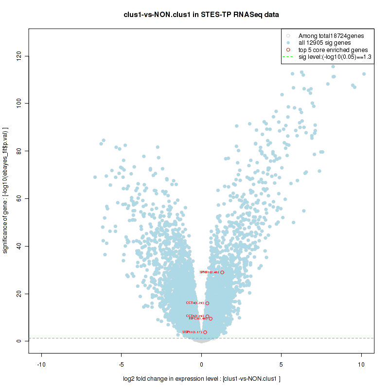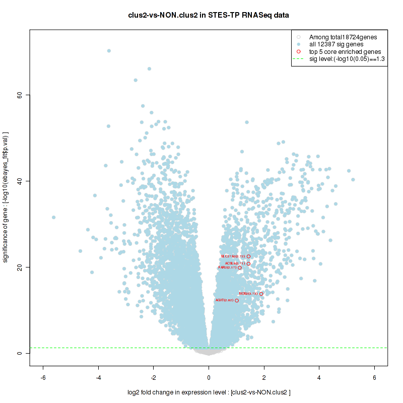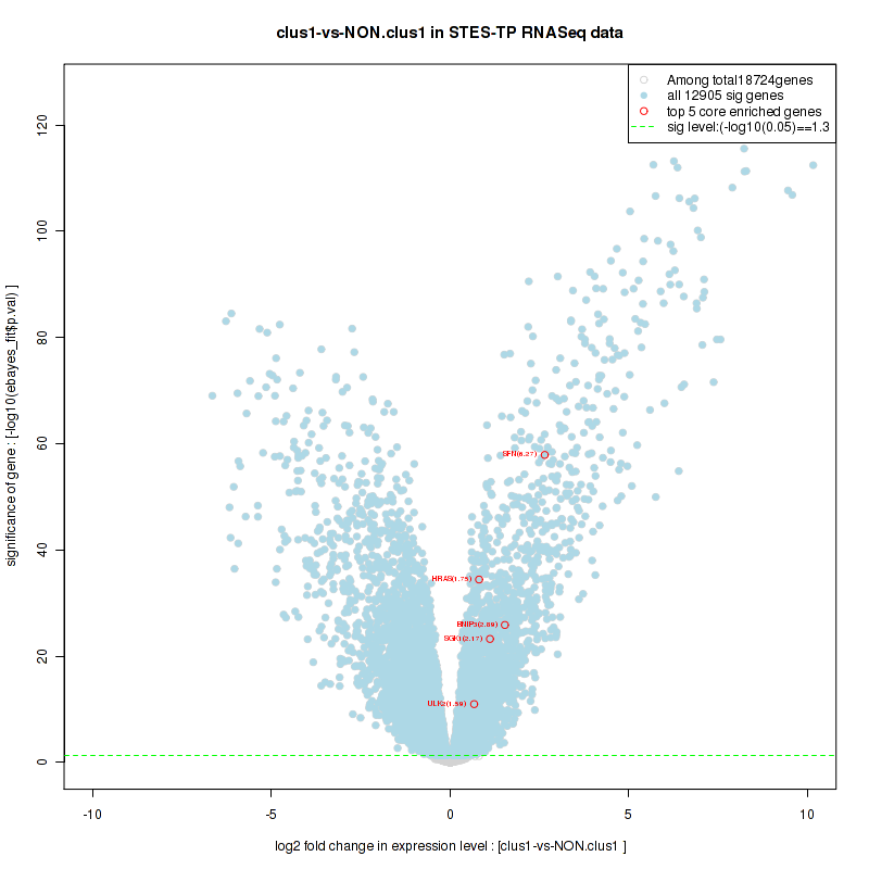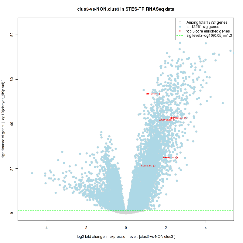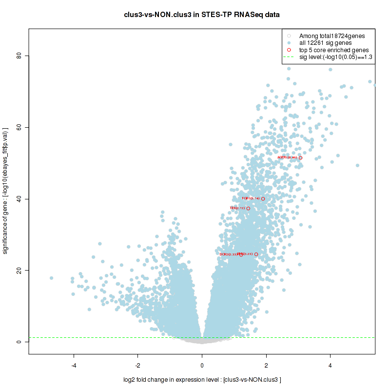Figure S58. Get High-res Image For the top 5 core enriched genes in the pathway: KEGG CYTOKINE CYTOKINE RECEPTOR INTERACTION, this volcano plot shows how much they are up/down-regulated and significant. The significance was calculated by empirical bayesian fit