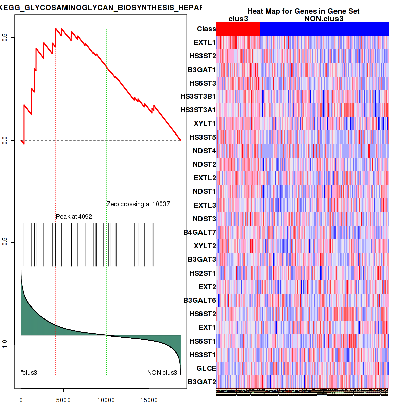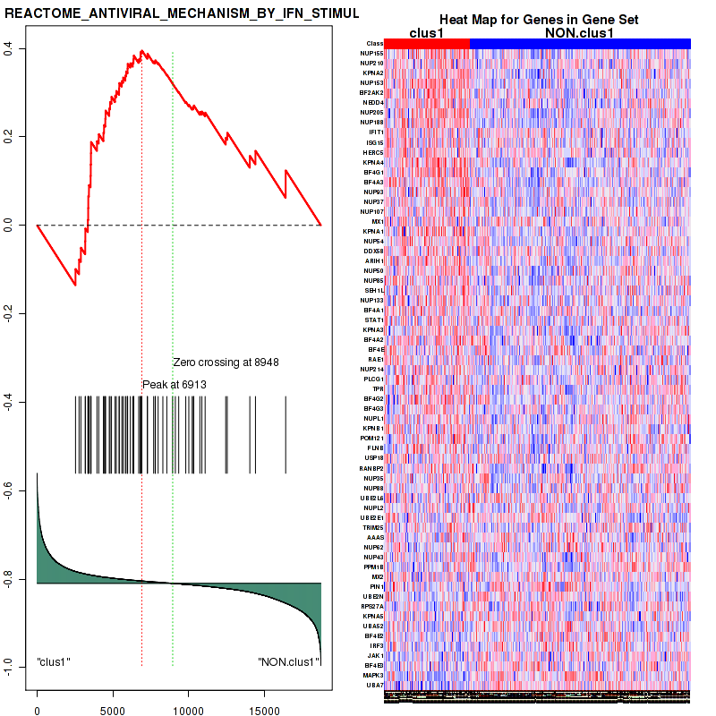Table 3. Get Full Table This table shows top 10 pathways which are significantly enriched in cluster clus1. It displays only significant gene sets satisfying nom.p.val.threshold (-1), fwer.p.val.threshold (-1) , fdr.q.val.threshold (0.25) and the default table is sorted by Normalized Enrichment Score (NES). Further details on NES statistics, please visit The Broad GSEA website.