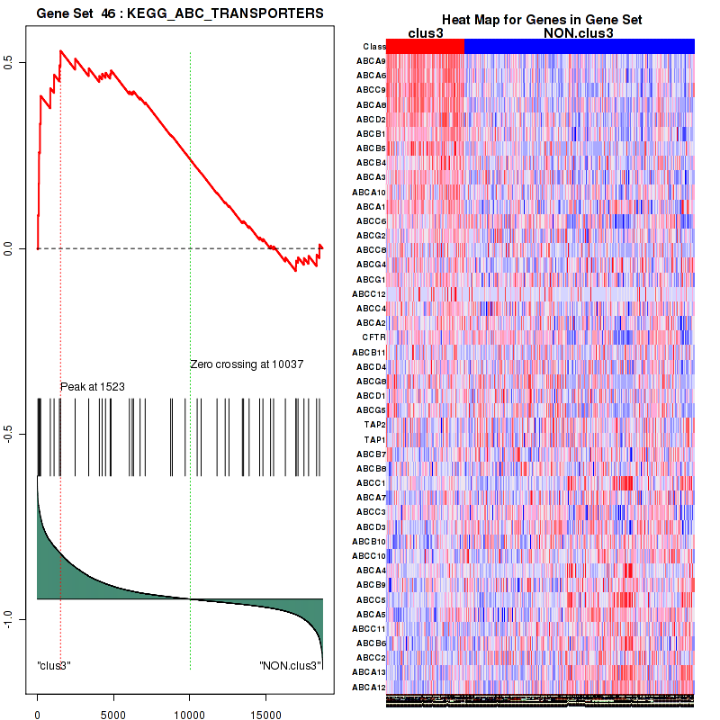 For the expression subtypes of 18744 genes in 600 samples, GSEA found enriched gene sets in each cluster using 599 gene sets in MSigDB canonical pathways. Top enriched gene sets are listed as below.
