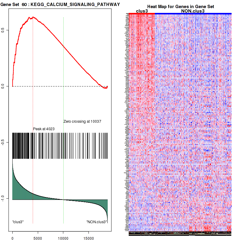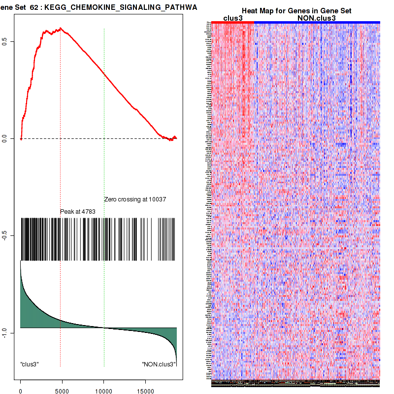 Figure S59. Get High-res Image This plot shows mRNAseq_cNMF expression data heatmap (on the left) a RunningEnrichmentScore(RES) plot (on the top right) and a Signal2Noise(S2N) plot (on the bottom right) of genes in the pathway: KEGG CHEMOKINE SIGNALING PATHWAY.