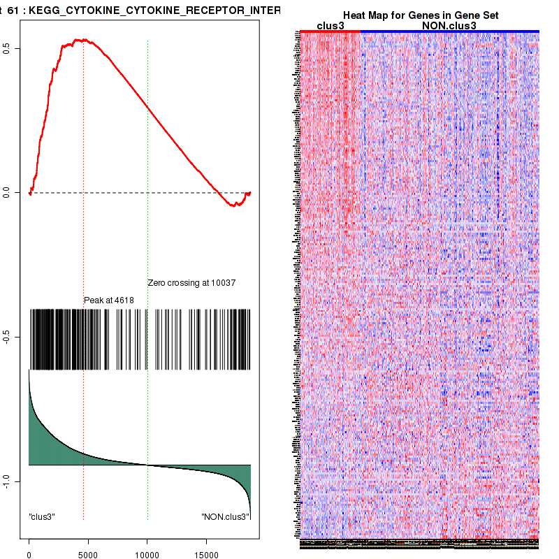 Figure S57. Get High-res Image This plot shows mRNAseq_cNMF expression data heatmap (on the left) a RunningEnrichmentScore(RES) plot (on the top right) and a Signal2Noise(S2N) plot (on the bottom right) of genes in the pathway: KEGG CYTOKINE CYTOKINE RECEPTOR INTERACTION.