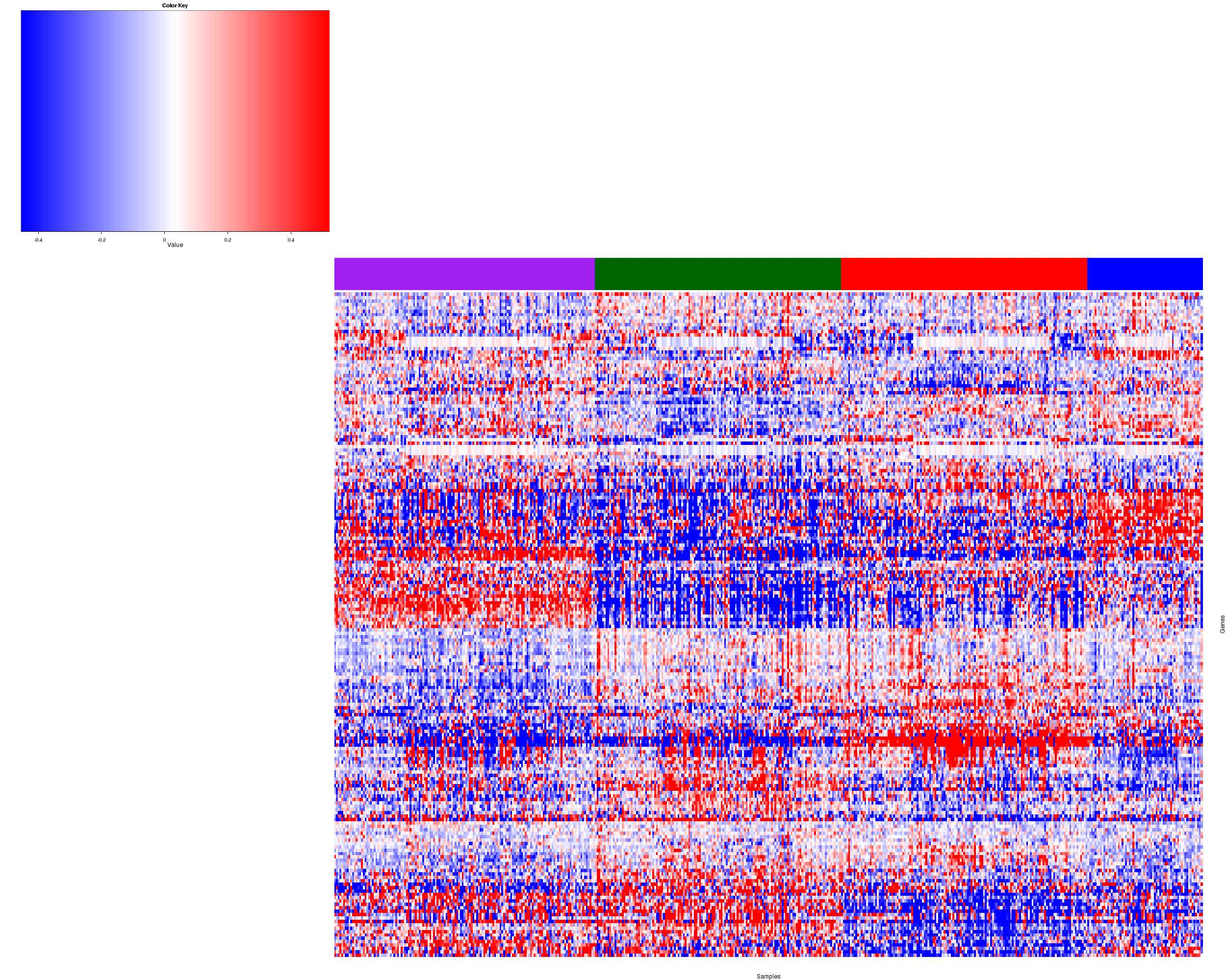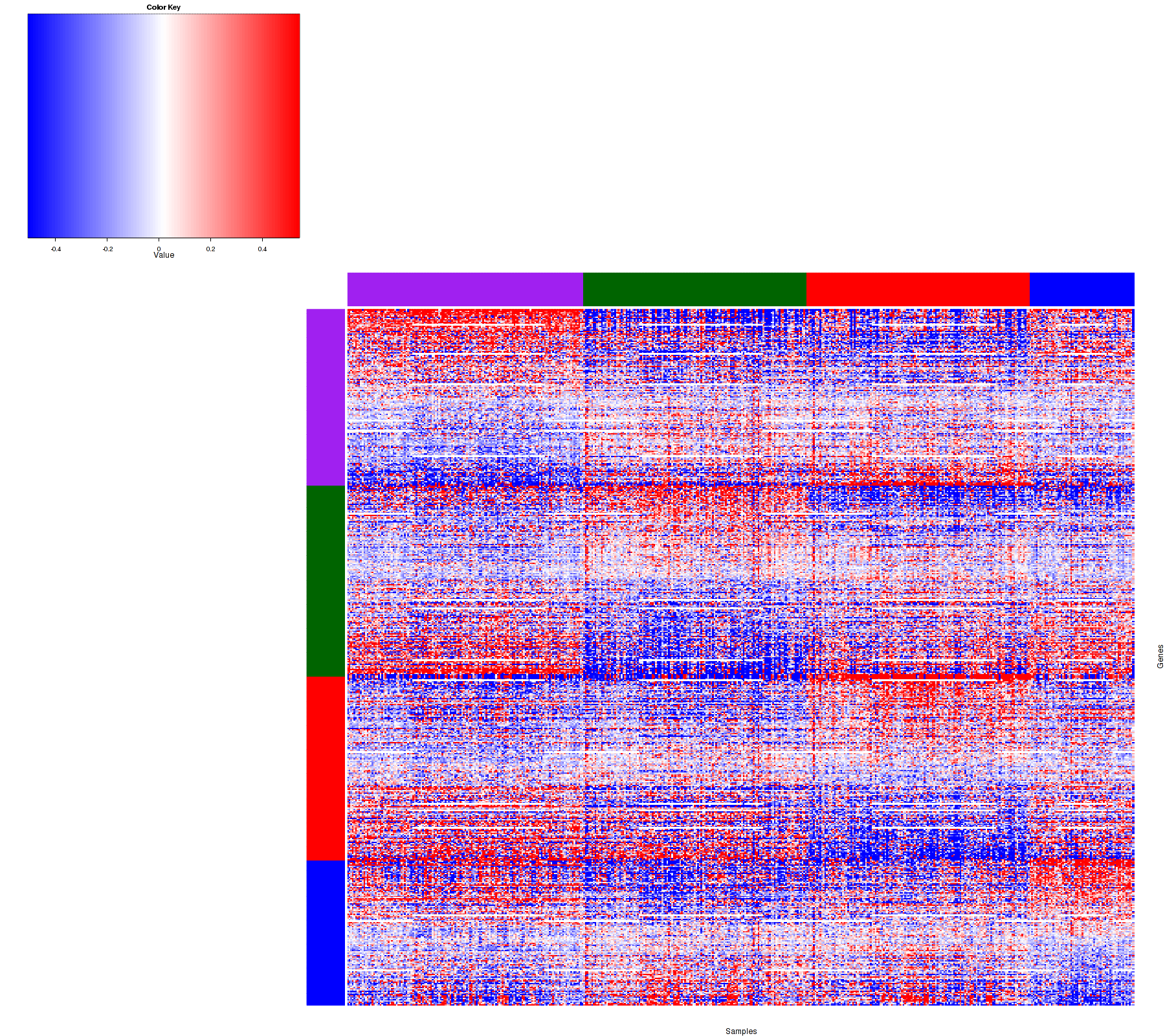 Figure 1. Get High-res Image Samples were separated into 4 clusters. Shown are 483 samples and 552 marker proteins. The color bar of the row indicates the marker proteins for the corresponding cluster.
