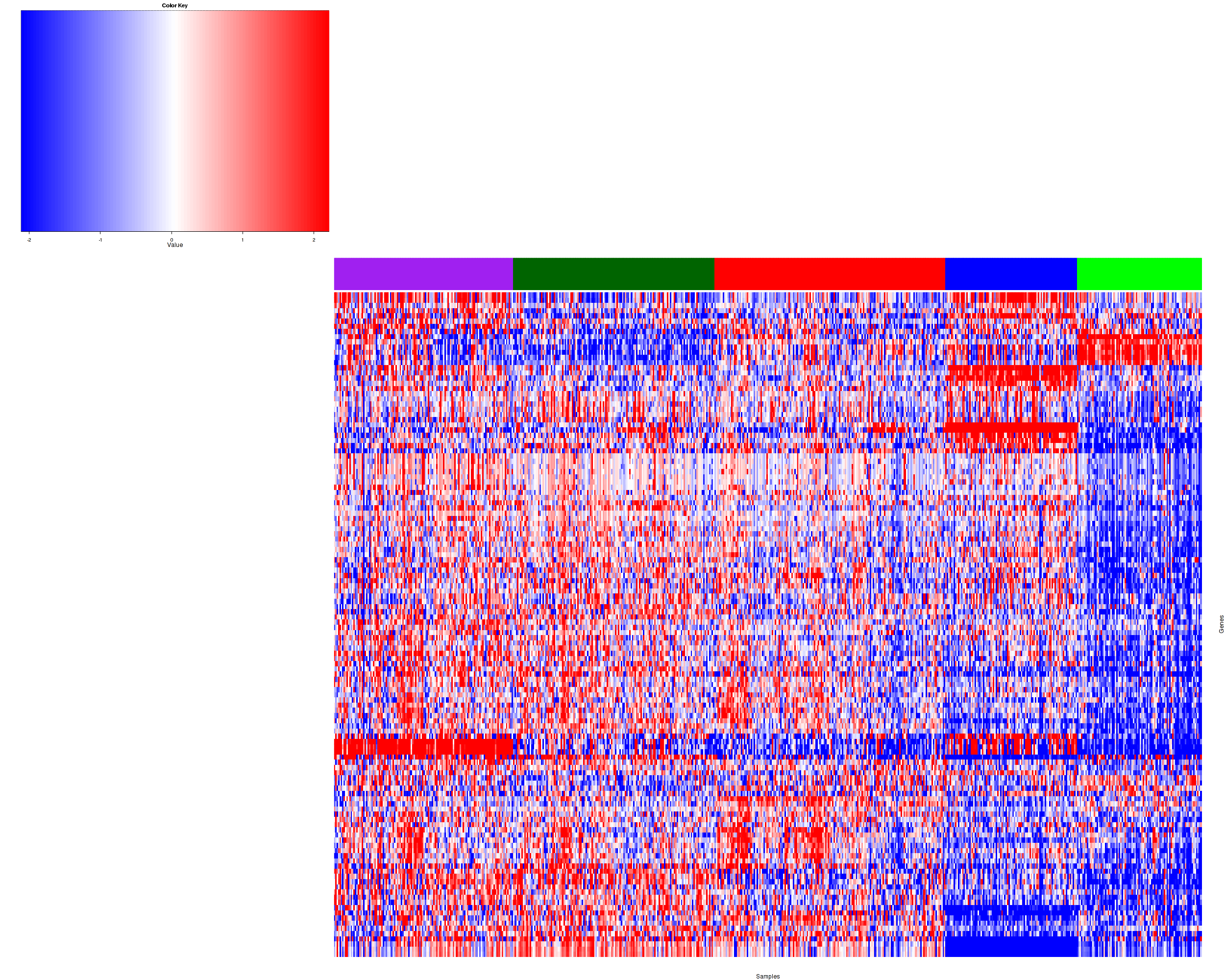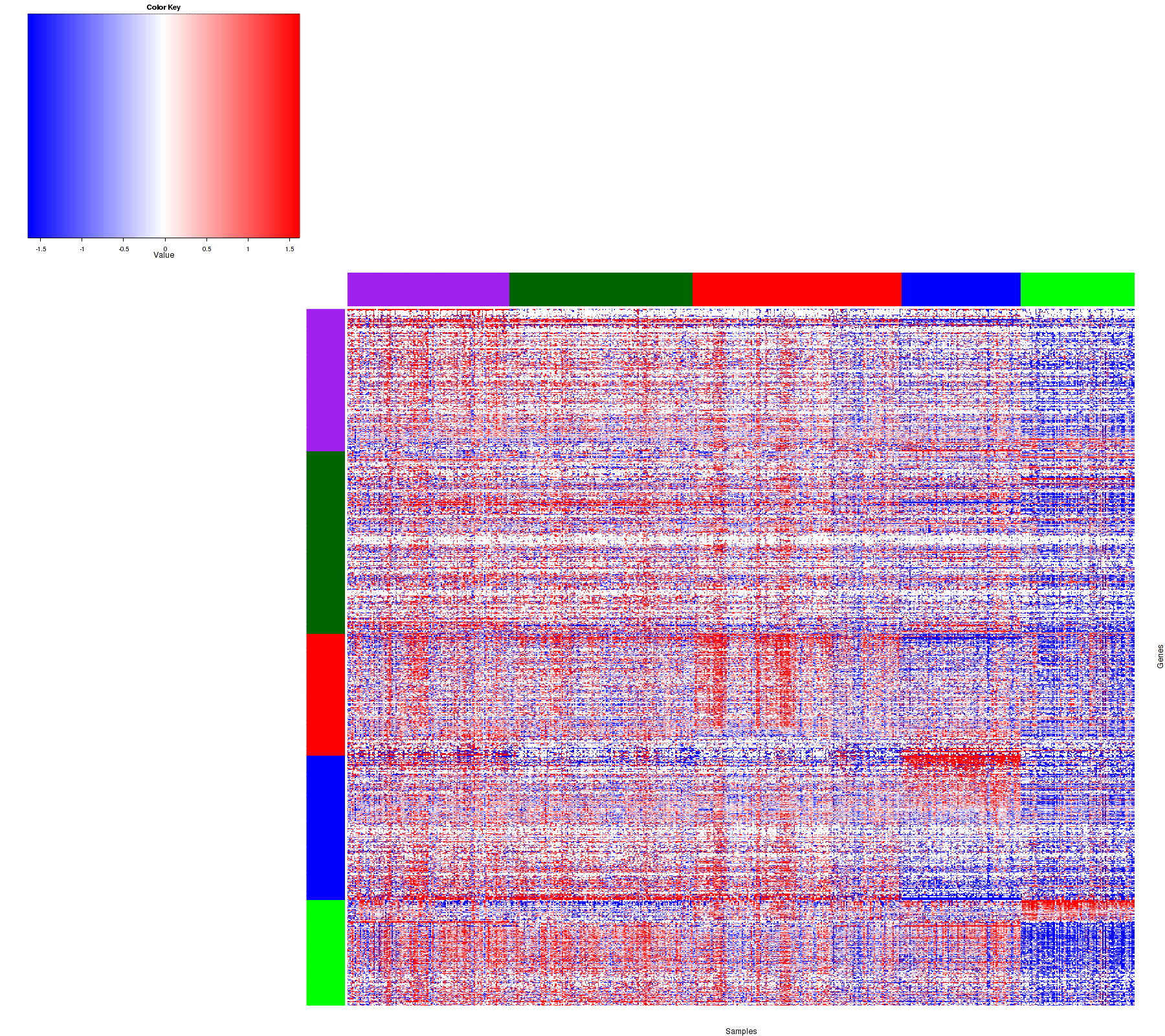 Figure 1. Get High-res Image Samples were separated into 5 clusters. Shown are 620 samples and 1238 marker miRs. The color bar of the row indicates the marker miRs for the corresponding cluster.