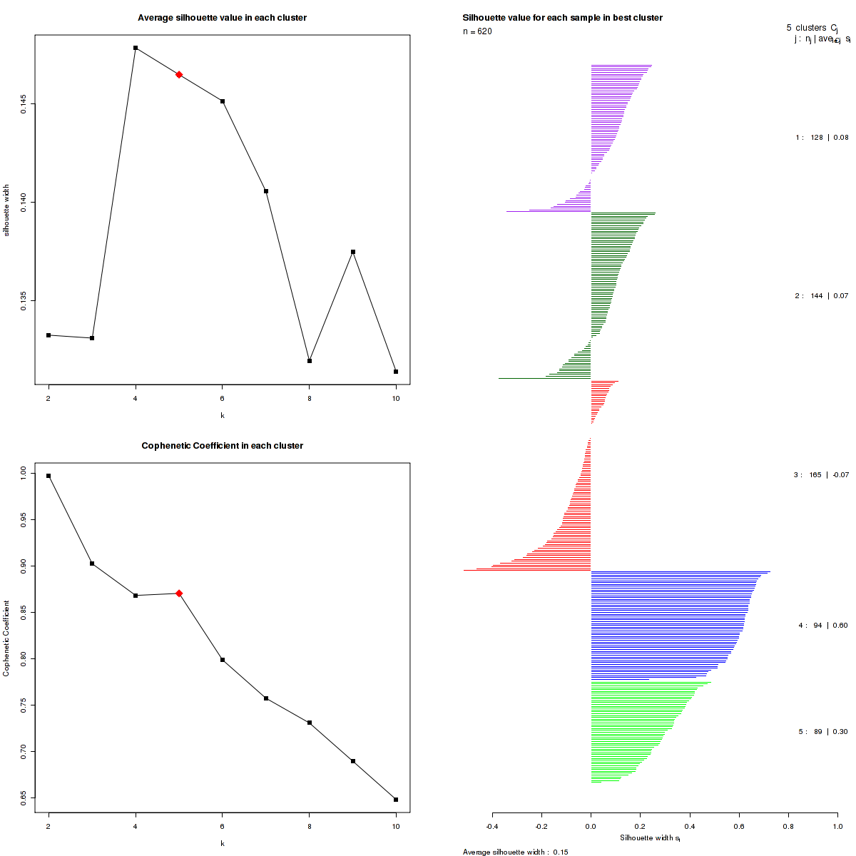 The cophenetic correlation coefficients and average silhouette values are used to determine the k with the most robust clusterings. From the plot of cophenetic correlation versus k, we select modes and the the point preceding the greatest decrease in cophenetic correlation coefficient, and from these choose the k with the highest average silhouette value.