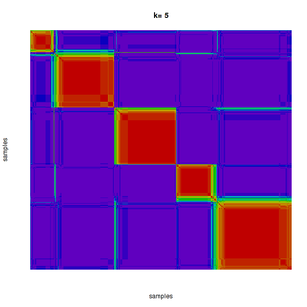Figure 4. Get High-res Image The consensus matrix after clustering shows 5 clusters with limited overlap between clusters.