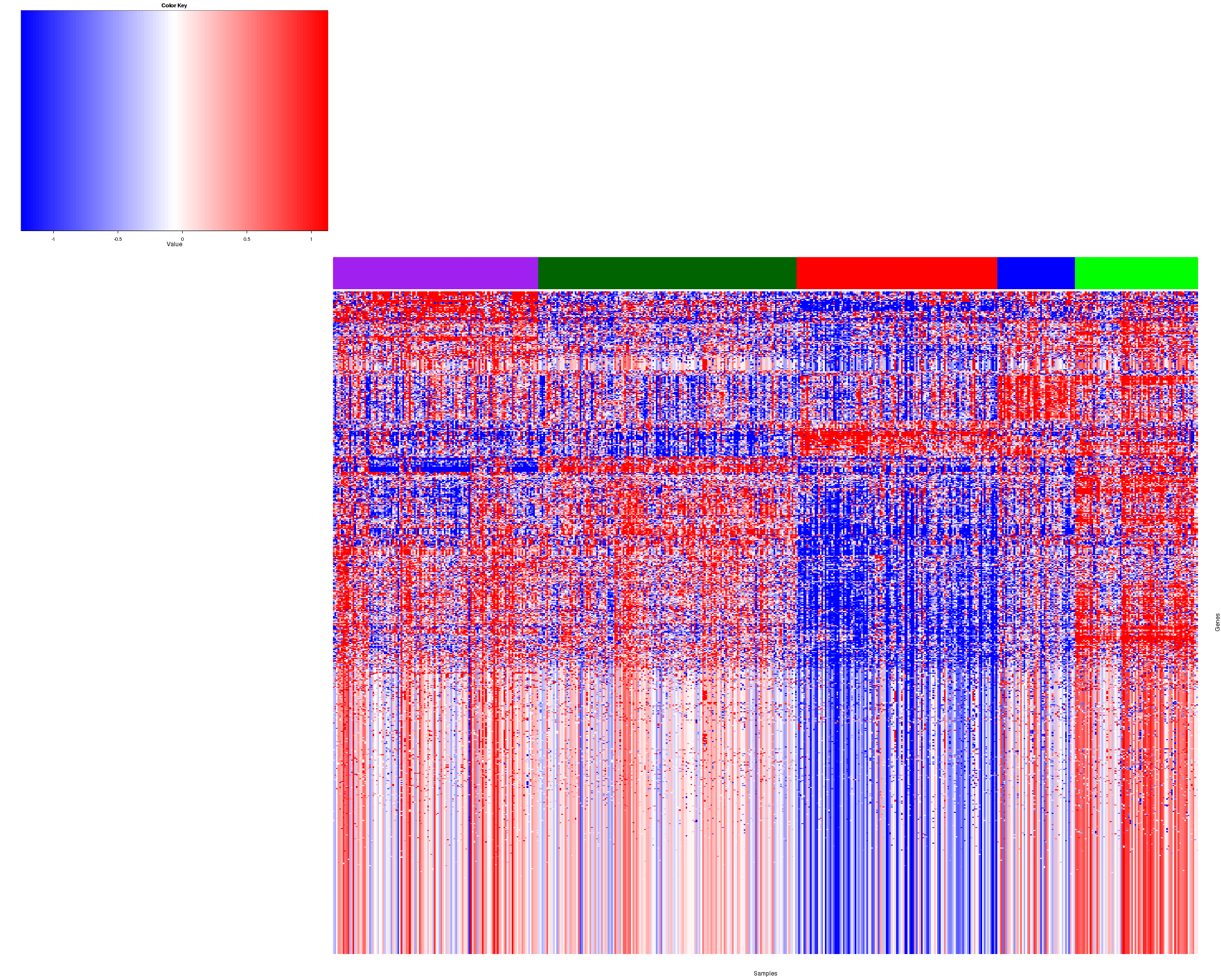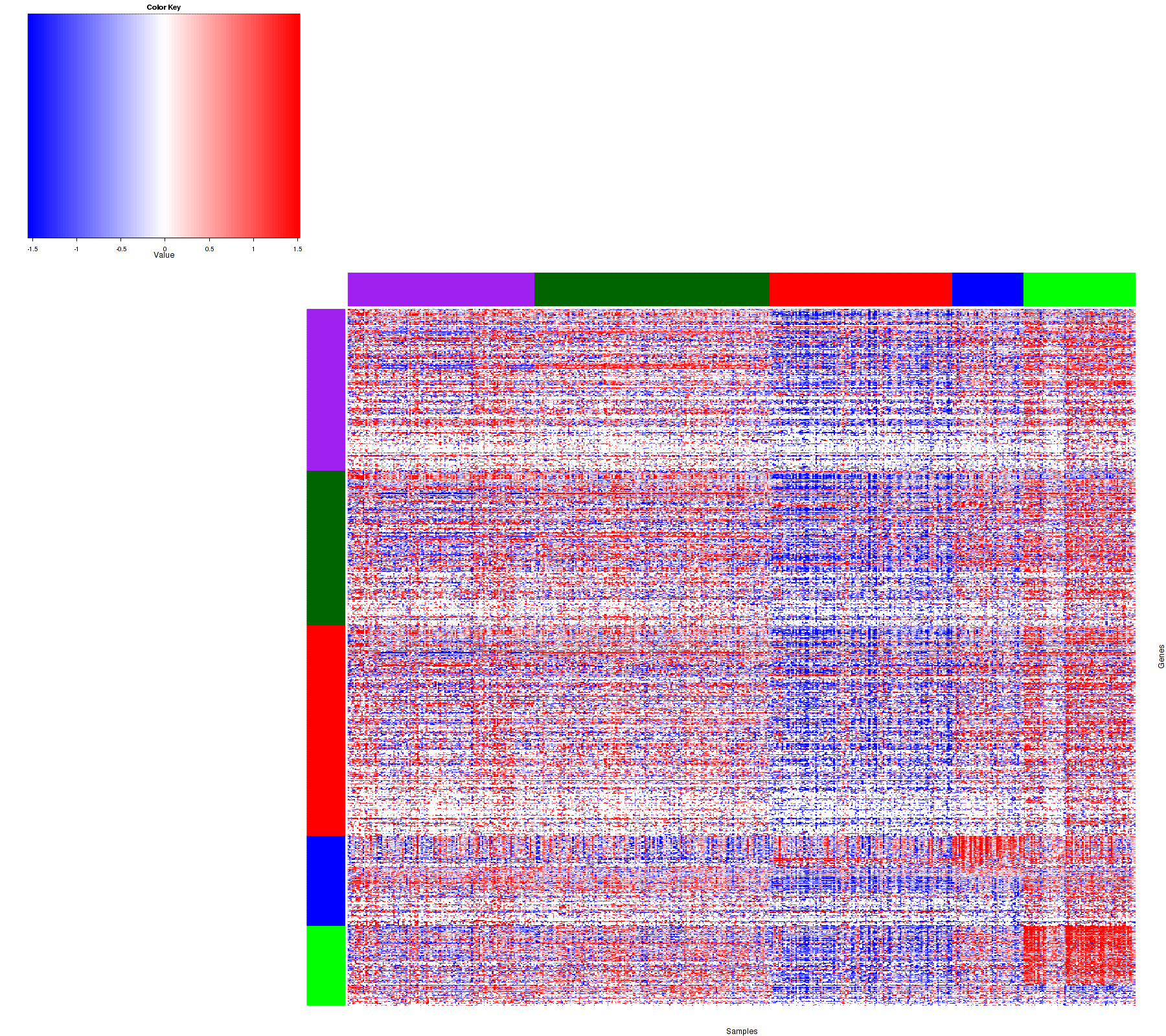 Figure 1. Get High-res Image Samples were separated into 5 clusters. Shown are 522 samples and 1770 marker miRs. The color bar of the row indicates the marker miRs for the corresponding cluster.
