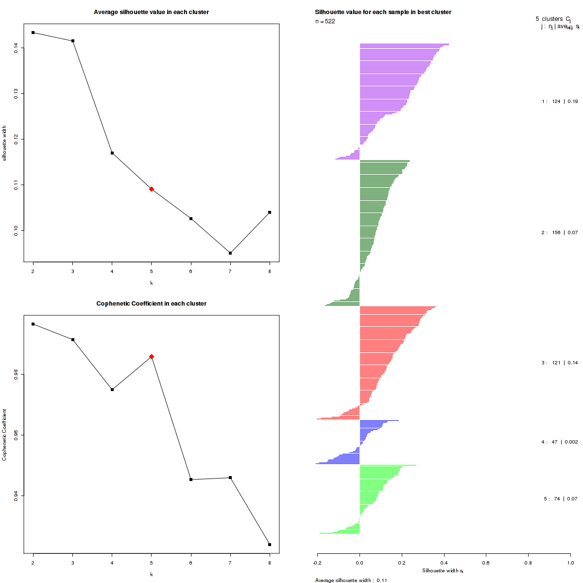 Figure 3. Get High-res Image The silhouette width was calculated for each sample and each value of k. The left upper panel shows the average silhouette width across all samples for each tested k (left upper panel). The left lower panel shows the Cophenetic Correlation Coefficients for each tested k. The right panel shows assignments of clusters to samples and the silhouette width of each sample for the most robust clustering.
