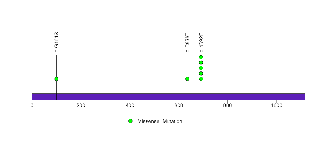 Figure S7. This figure depicts the distribution of mutations and mutation types across the MUC6 significant gene.
