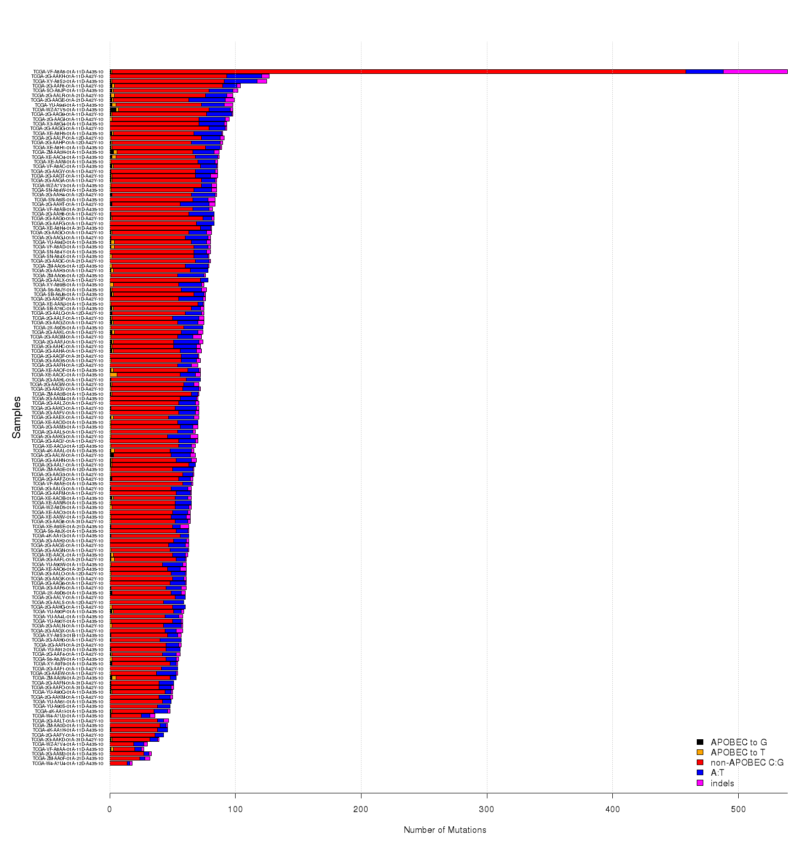 Figure 4. Get High-res Image Numbers of APOBEC and non-APOBEC mutations (X-axis) in each sample (Y-axis). All values are calculated based on the values in the columns “indels”, “substitutions”, and columns containing individual substitution types in the “*_sorted_sum_all_fisher_Pcorr.txt” file. “APOBEC to G” – number of tCw→tGw mutations; “APOBEC to T” – number of tCw→tTw mutations; “non-APOBEC C:G” – number of mutations in C:G base pairs not conforming to the APOBEC signature (= total of tCw→tAw plus all mutations in C not occurring in the tCw motif); “A:T” –- all mutations in A:T base pairs; “indels” – all indels. All counts include complementary mutations. Samples are ordered by total mutation counts in the descending order. Since only base substitutions are shown, bars with excessive numbers of non-substitution mutations may be shorter than the two flanking bars.