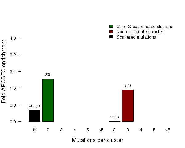 The presence of C- or G-coordinated clusters of closely spaced mutations. C- or G-coordinated mutation clusters contain stretches of mutations, each separated by <10,000 nt, that either occur only at cytosines or only in guanines of the same strand within a given cluster. Moreover, the probability of producing the spatial distribution of mutations in these clusters by random distribution of all the mutations estimated to occur within the genome is < 1E-4. C- or G-coordinated clusters are enriched with APOBEC signature mutations. The presence of such clusters supports a mechanism of mutagenesis via cytidine-specific lesions in transient stretches of ssDNA. Cluster analysis works the best for whole-genome sequence (WGS) data, but can have sufficient statistical power to be utilized with whole-exome sequencing (WES). The results of cluster analysis are shown on Figures 6–9.