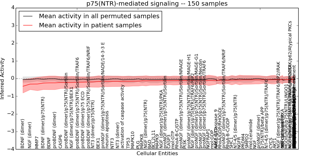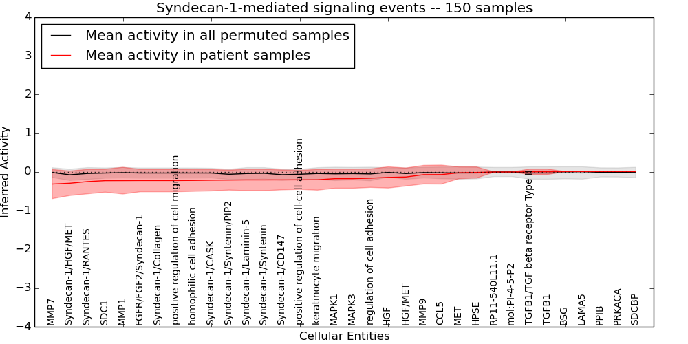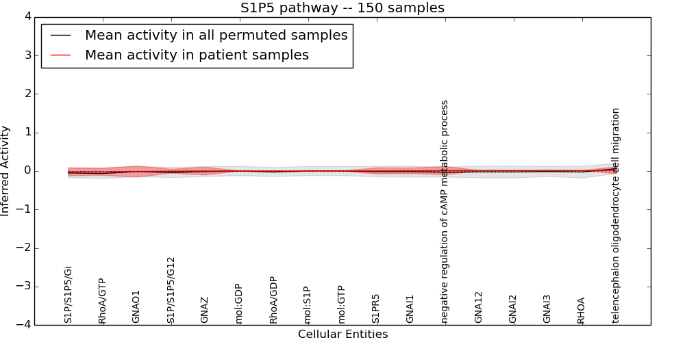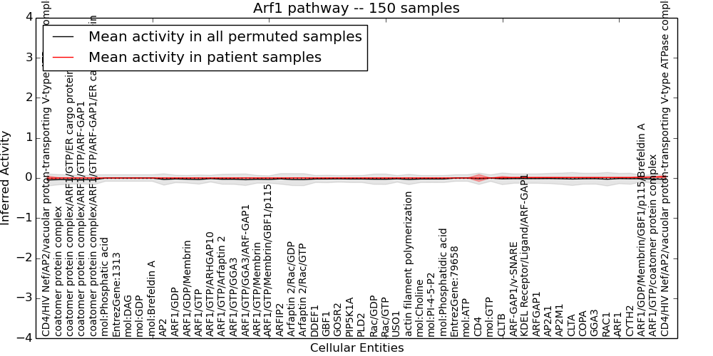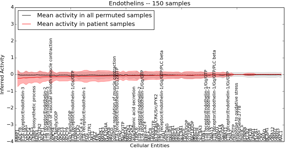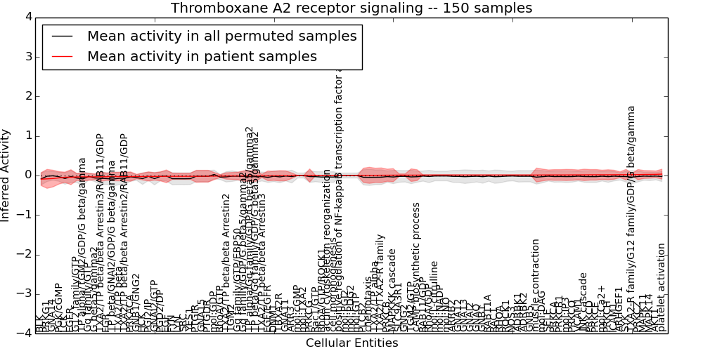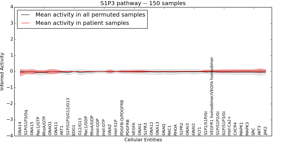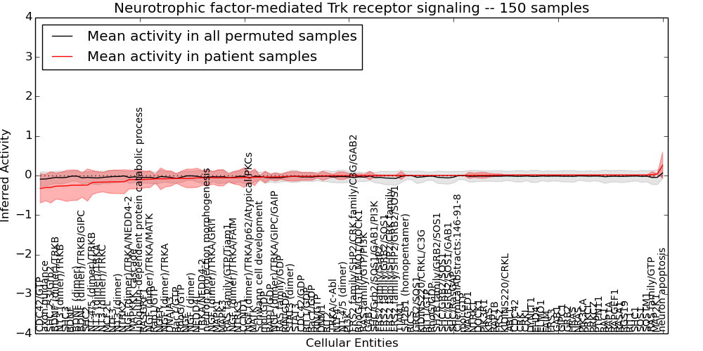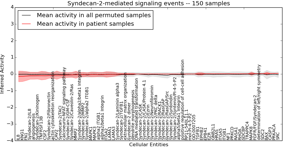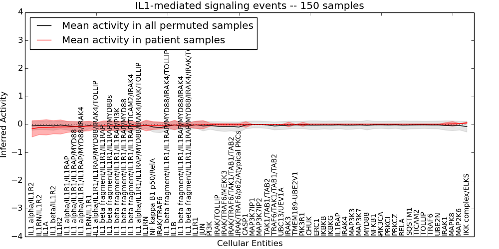 Figure S131. Get High-res Image This plot shows pathway concept perturbations across all samples against a permutation model. The concepts along the x-axis are sorted by lowest to highest mean activity for the real patient samples. Mean inferred activities are plotted along the y-axis as a colored band showing the average level and one standard deviation range. Real samples are shown in red and permuted samples in black.