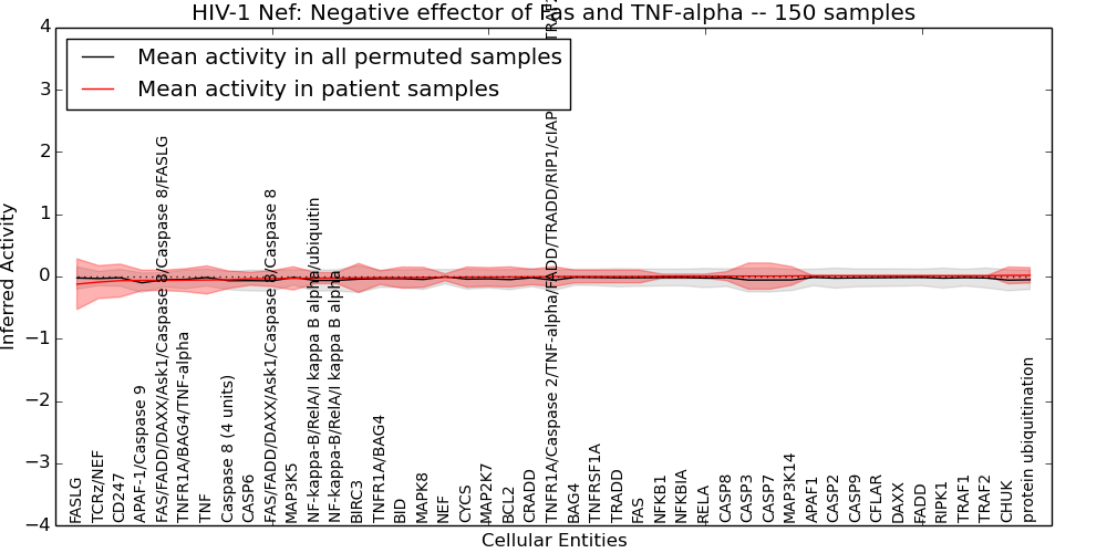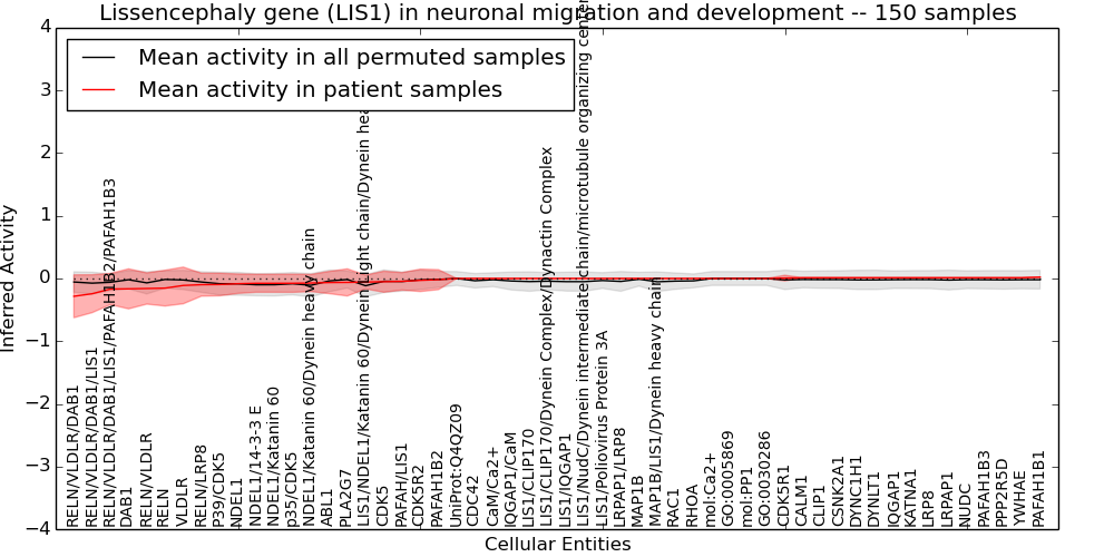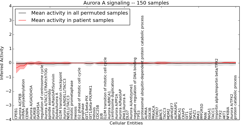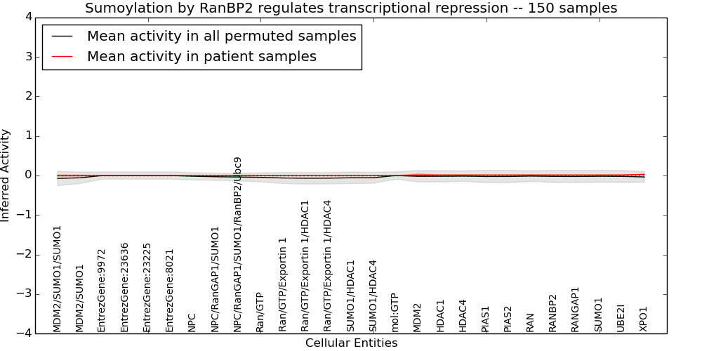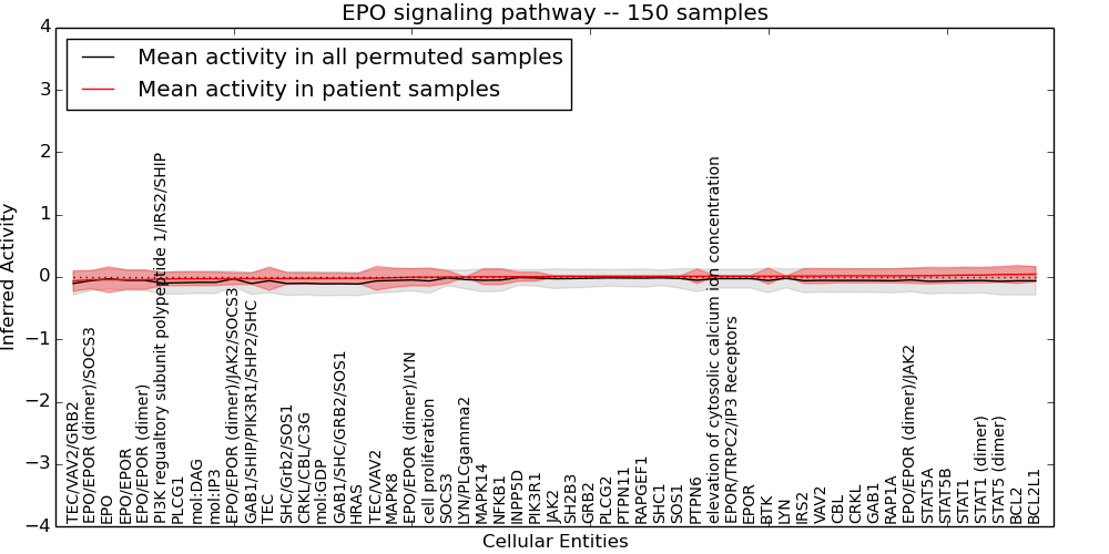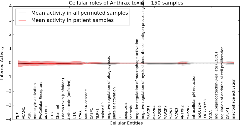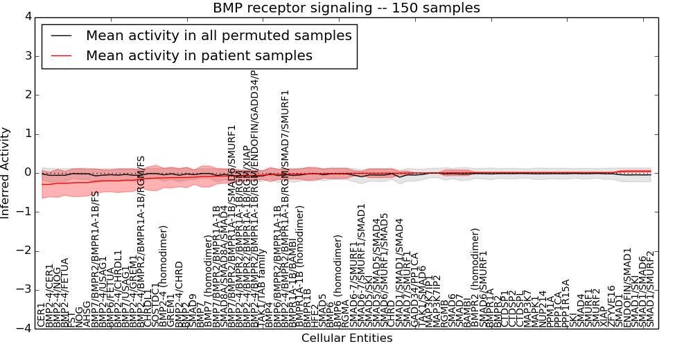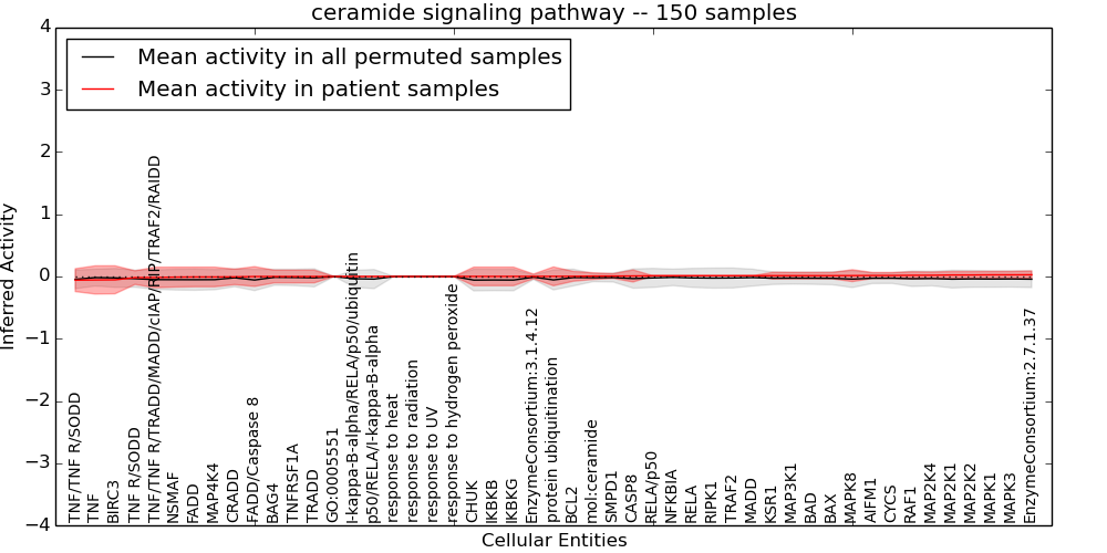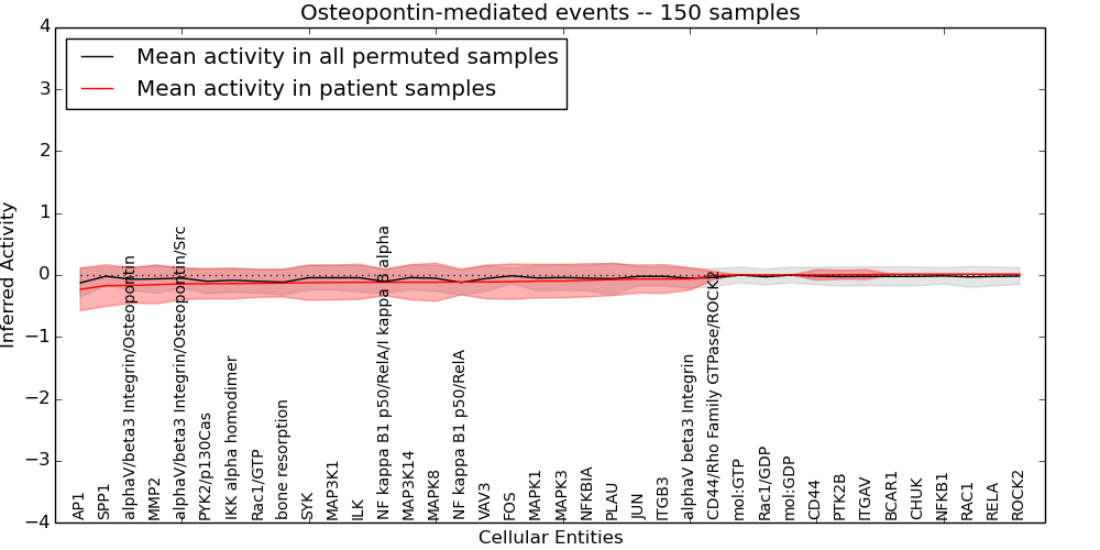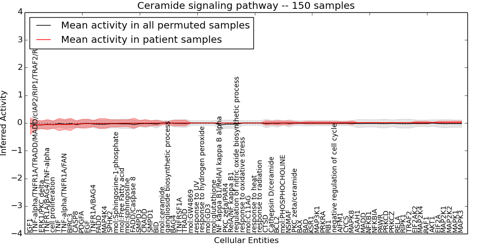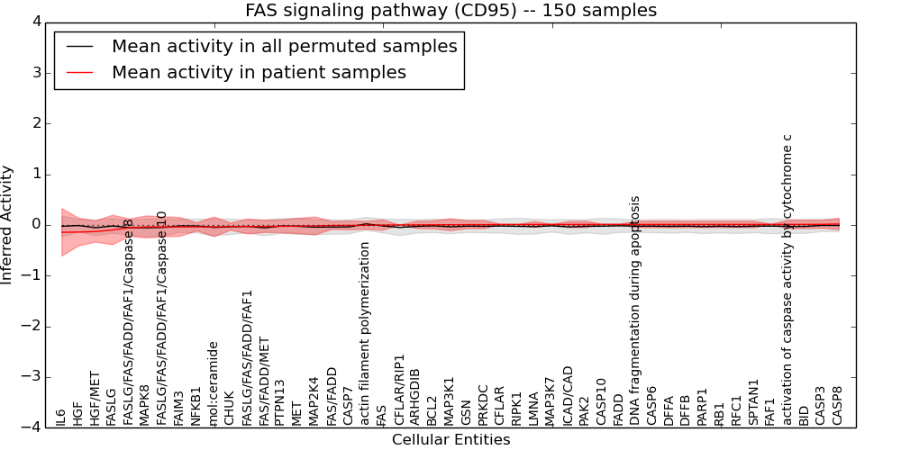 Figure S131. Get High-res Image This plot shows pathway concept perturbations across all samples against a permutation model. The concepts along the x-axis are sorted by lowest to highest mean activity for the real patient samples. Mean inferred activities are plotted along the y-axis as a colored band showing the average level and one standard deviation range. Real samples are shown in red and permuted samples in black.