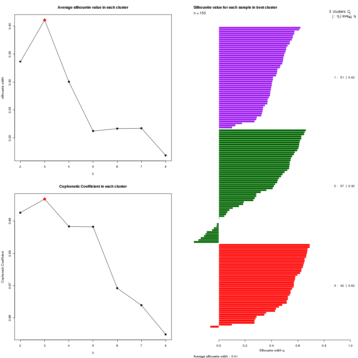 Figure 3. Get High-res Image The silhouette width was calculated for each sample and each value of k. The left upper panel shows the average silhouette width across all samples for each tested k (left upper panel). The left lower panel shows the Cophenetic Correlation Coefficients for each tested k. The right panel shows assignments of clusters to samples and the silhouette width of each sample for the most robust clustering.