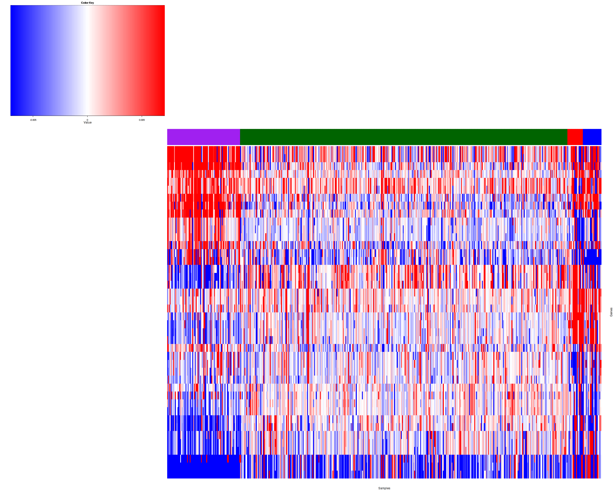 Figure 1. Get High-res Image Samples were separated into 4 clusters. Shown are 499 samples and 73 marker focal events. The color bar of the row indicates the marker focal events for the corresponding cluster.