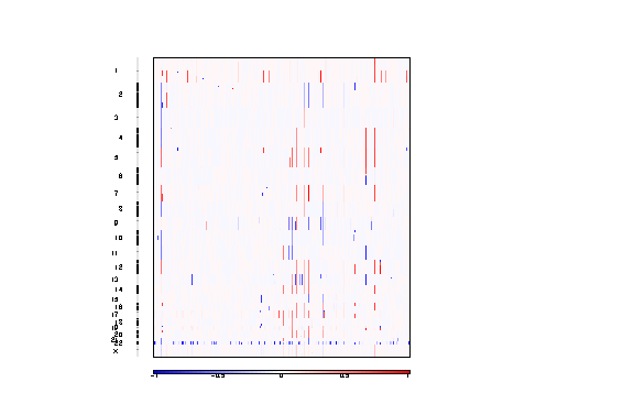 A table of chromosome arm amplification levels for each sample. Each row is a chromosome arm, and each column a sample. The data are in units of absolute copy number -2.
