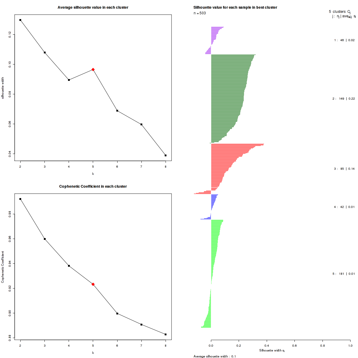 The most robust consensus NMF clustering of 503 samples using the 4852 most variable genes was identified for k = 5 clusters. We computed the clustering for k = 2 to k = 10 and uused the cophenetic correlation coefficient and the average silhouette width calculation to determine the robust clusters.
