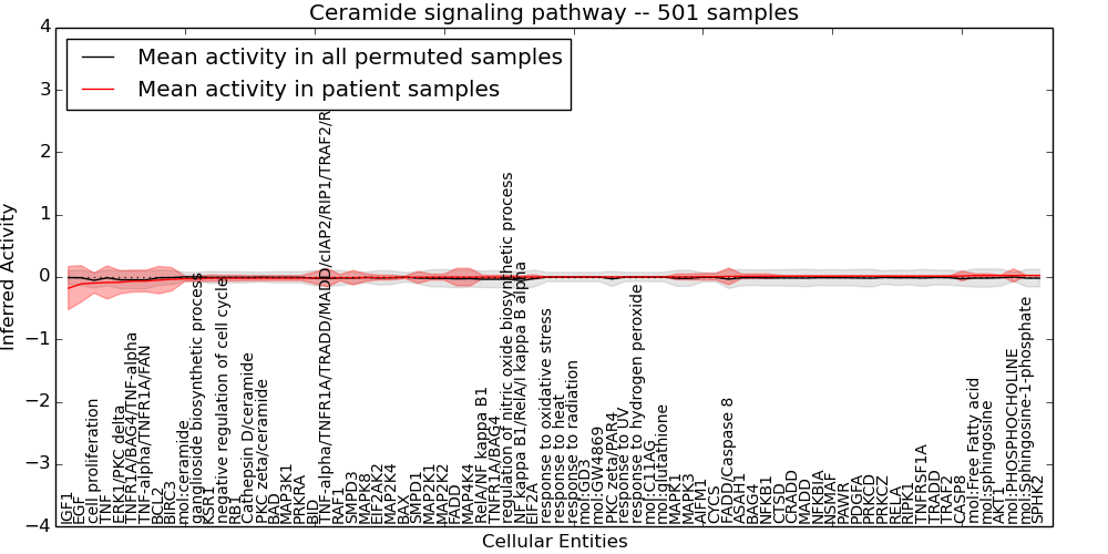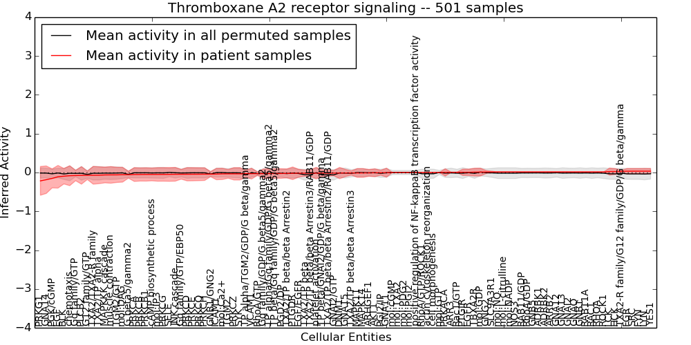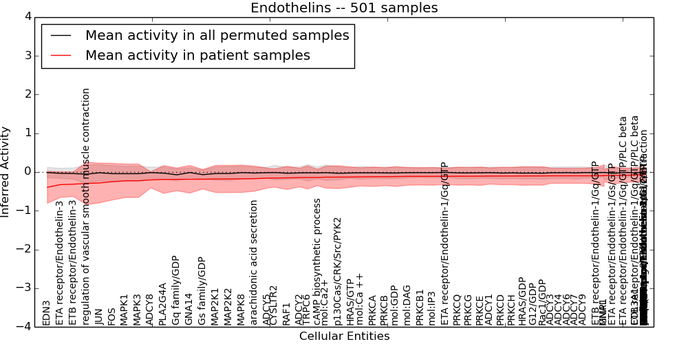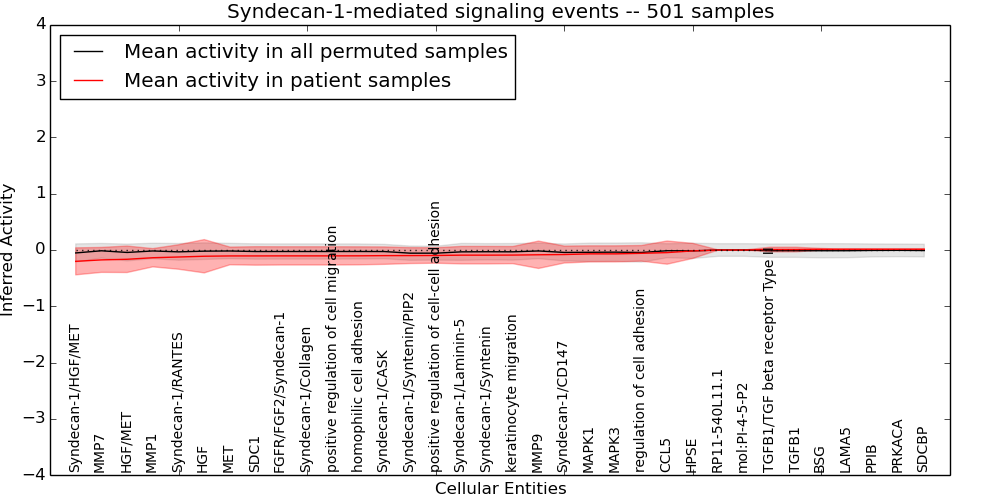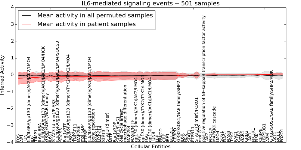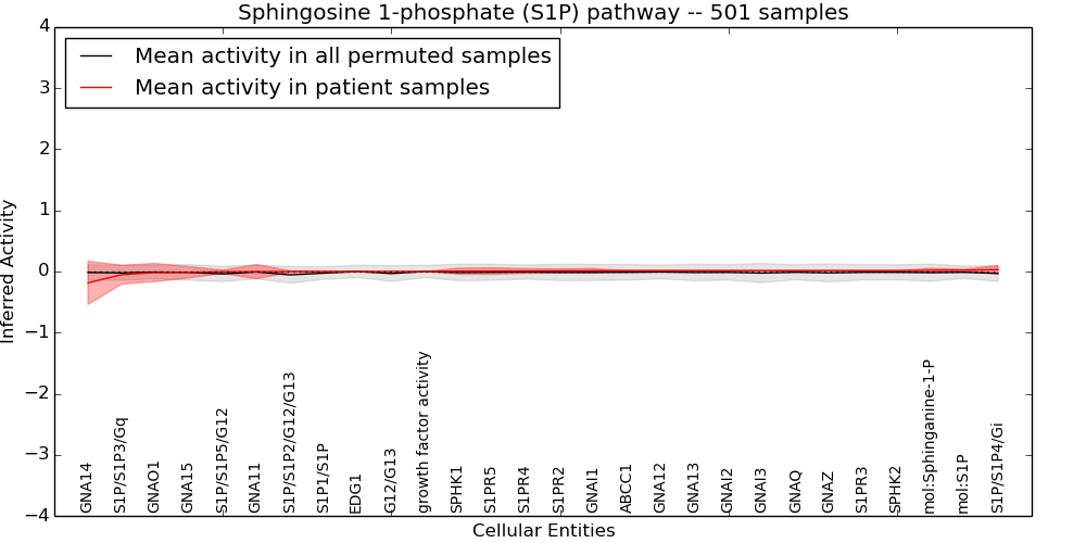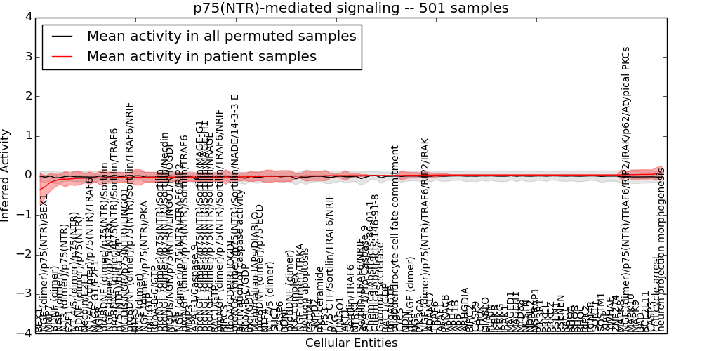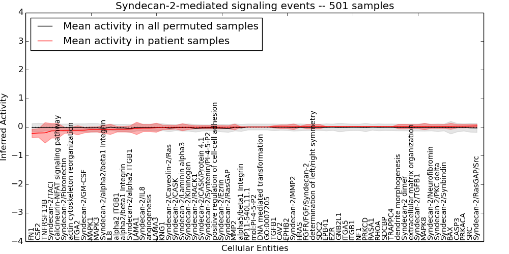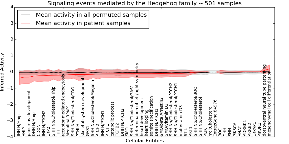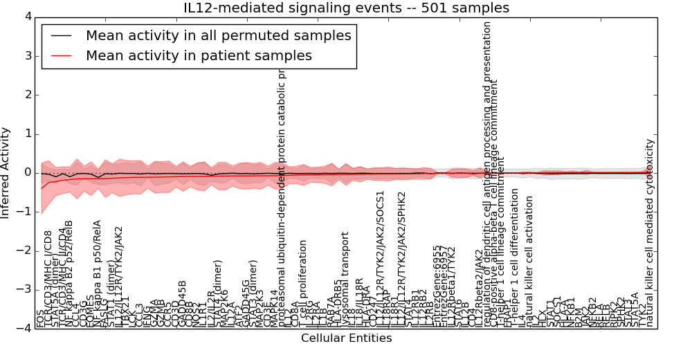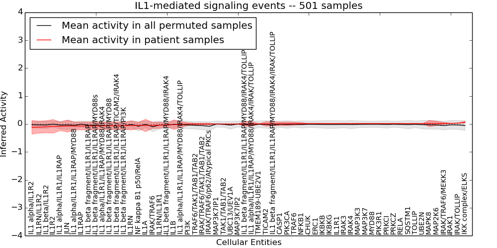 Figure S131.  Get High-res Image This plot shows pathway concept perturbations across all samples against a permutation model. The concepts along the x-axis are sorted by lowest to highest mean activity for the real patient samples. Mean inferred activities are plotted along the y-axis as a colored band showing the average level and one standard deviation range. Real samples are shown in red and permuted samples in black.