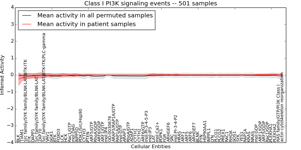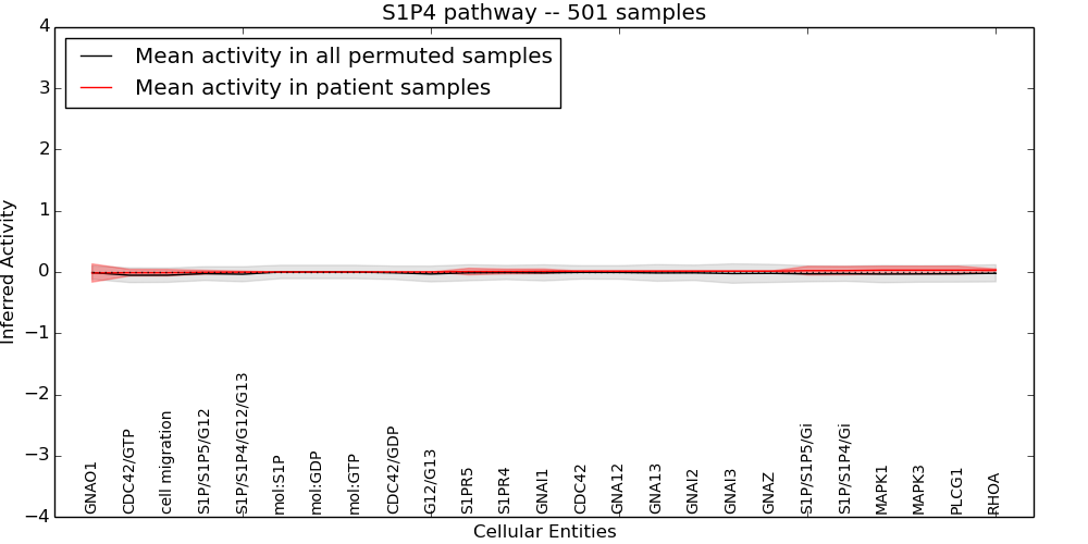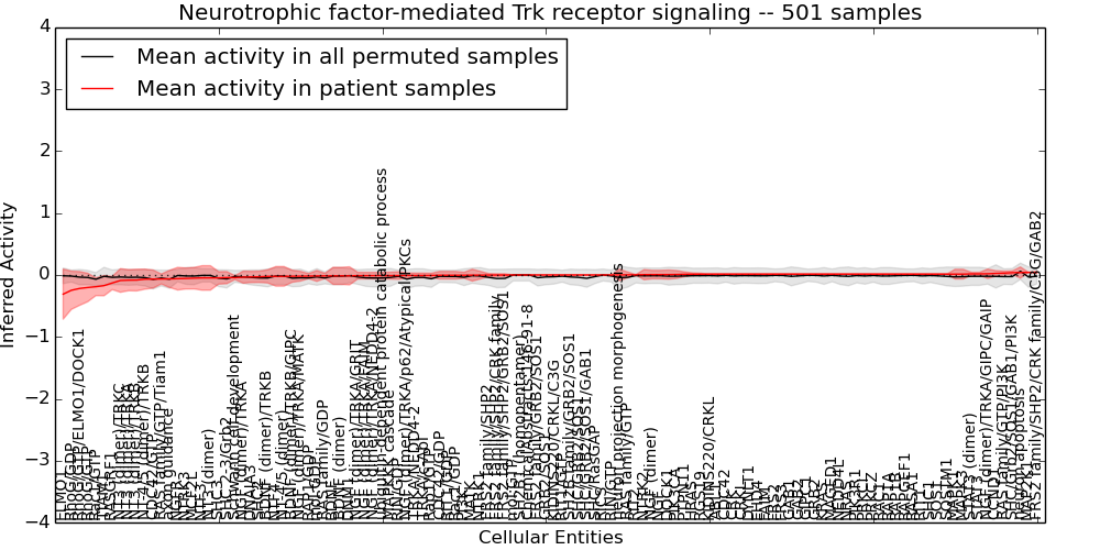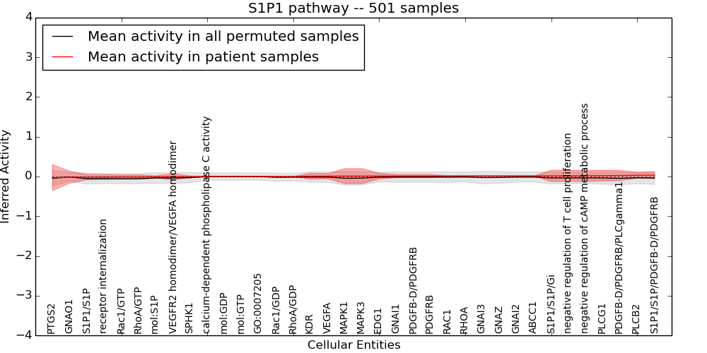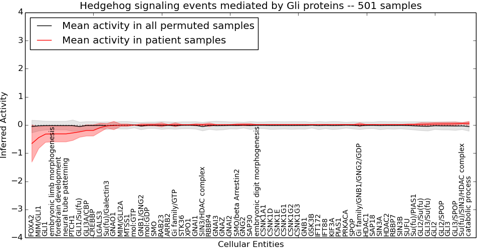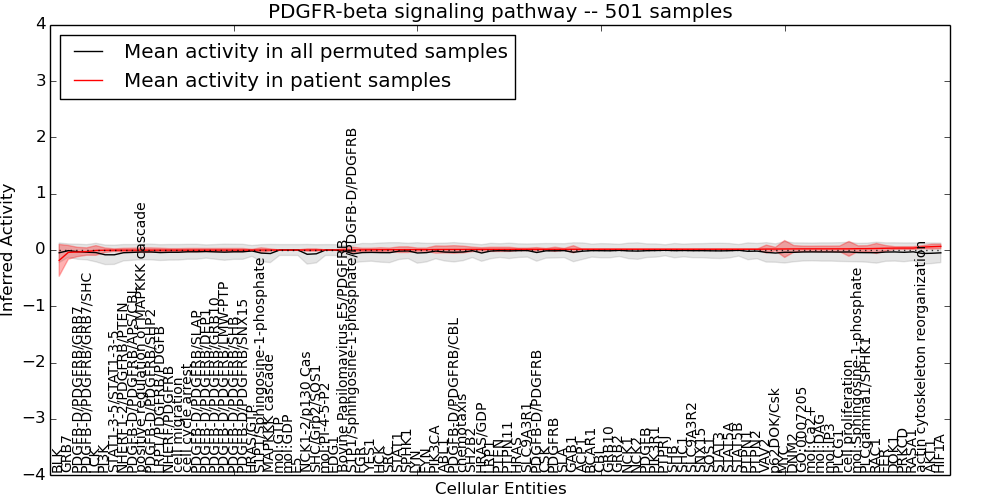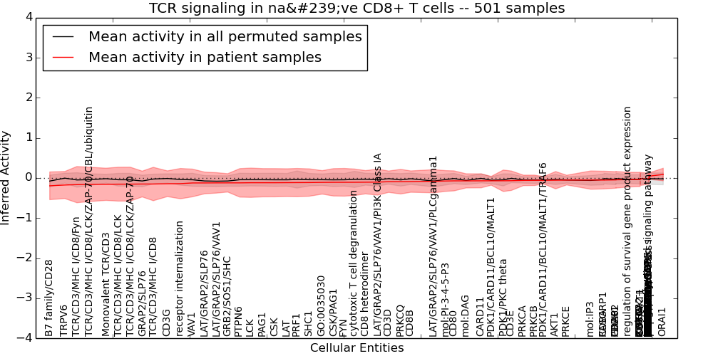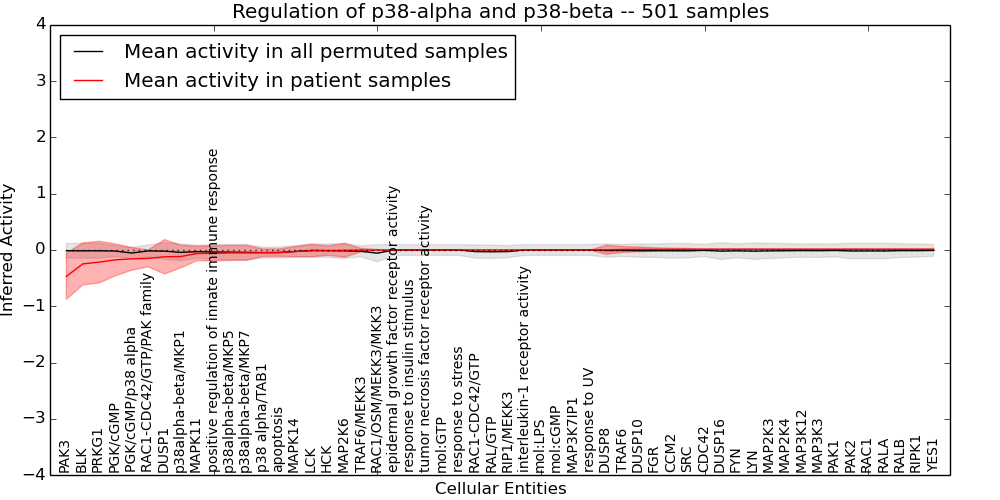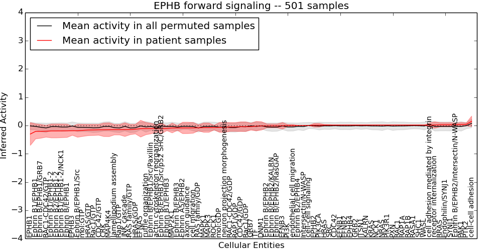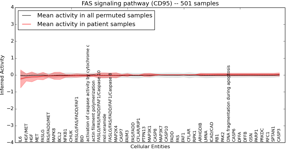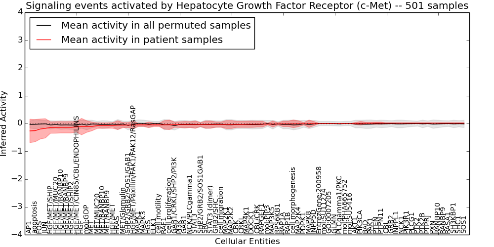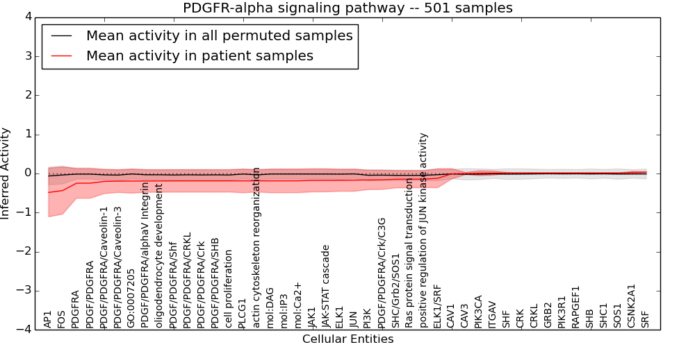 Figure S131.  Get High-res Image This plot shows pathway concept perturbations across all samples against a permutation model. The concepts along the x-axis are sorted by lowest to highest mean activity for the real patient samples. Mean inferred activities are plotted along the y-axis as a colored band showing the average level and one standard deviation range. Real samples are shown in red and permuted samples in black.