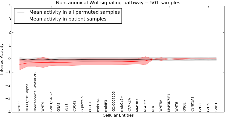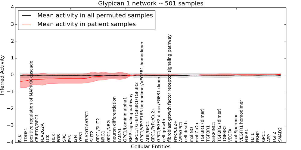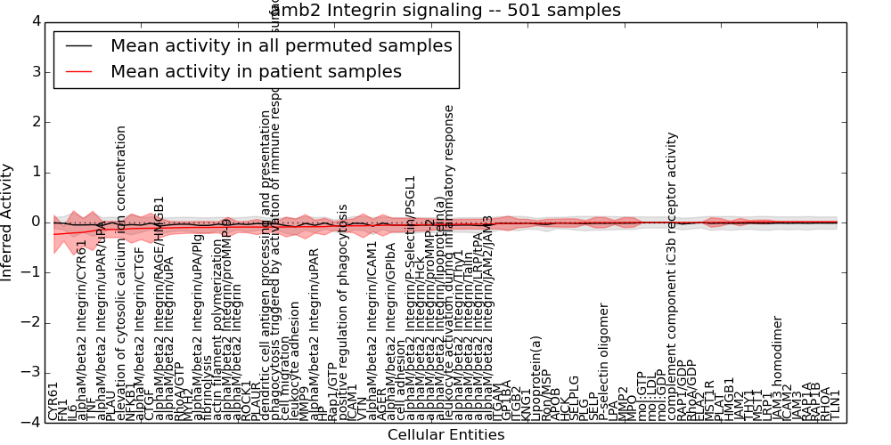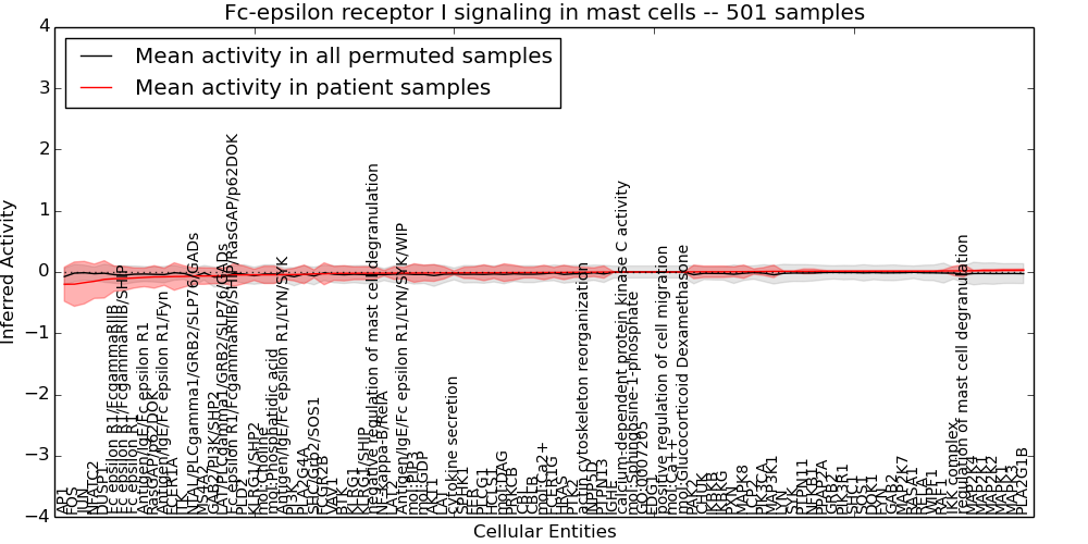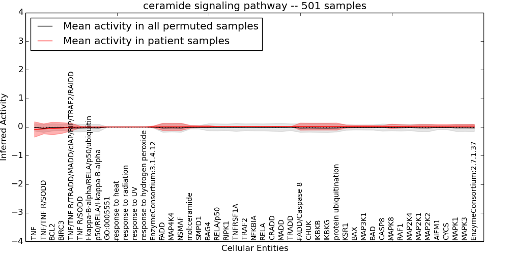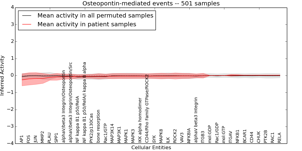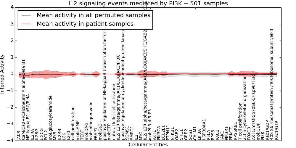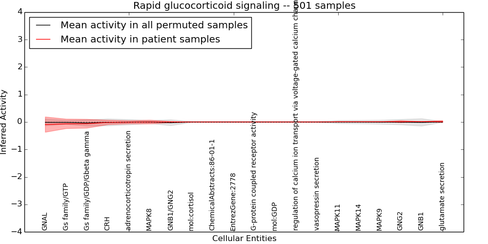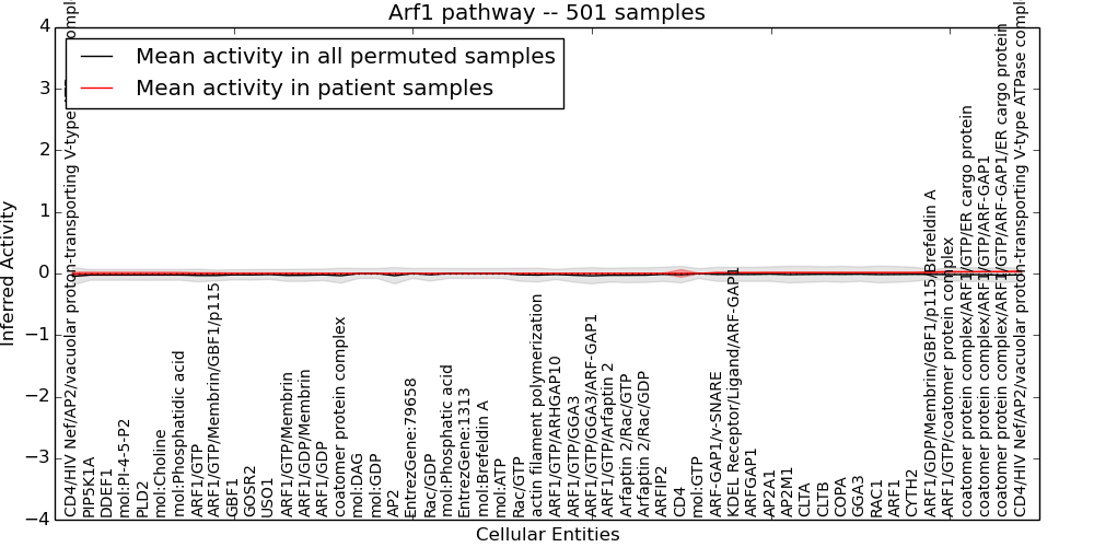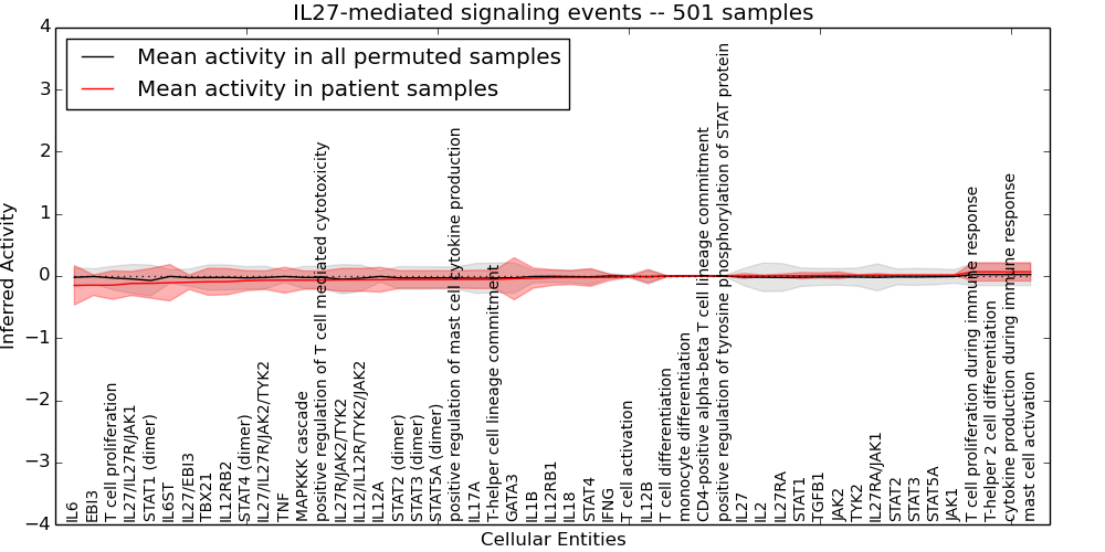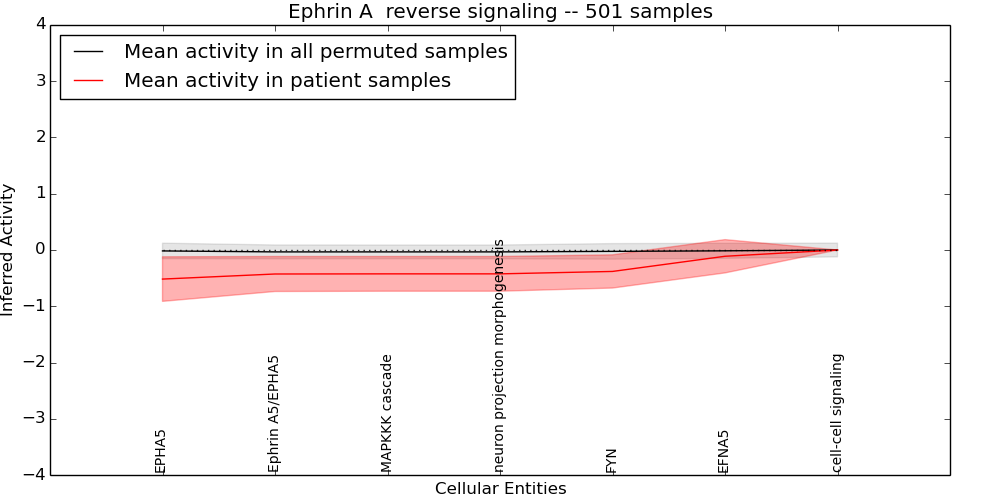 Figure S131.  Get High-res Image This plot shows pathway concept perturbations across all samples against a permutation model. The concepts along the x-axis are sorted by lowest to highest mean activity for the real patient samples. Mean inferred activities are plotted along the y-axis as a colored band showing the average level and one standard deviation range. Real samples are shown in red and permuted samples in black.