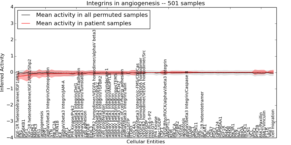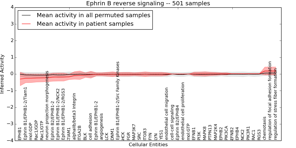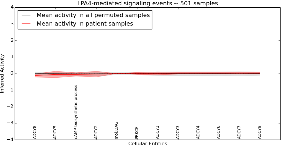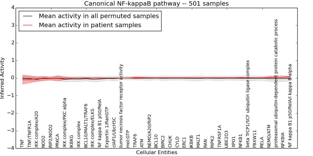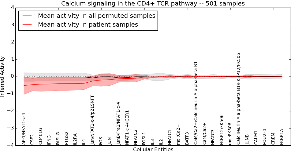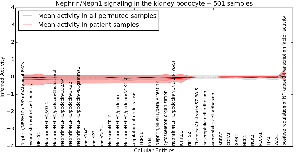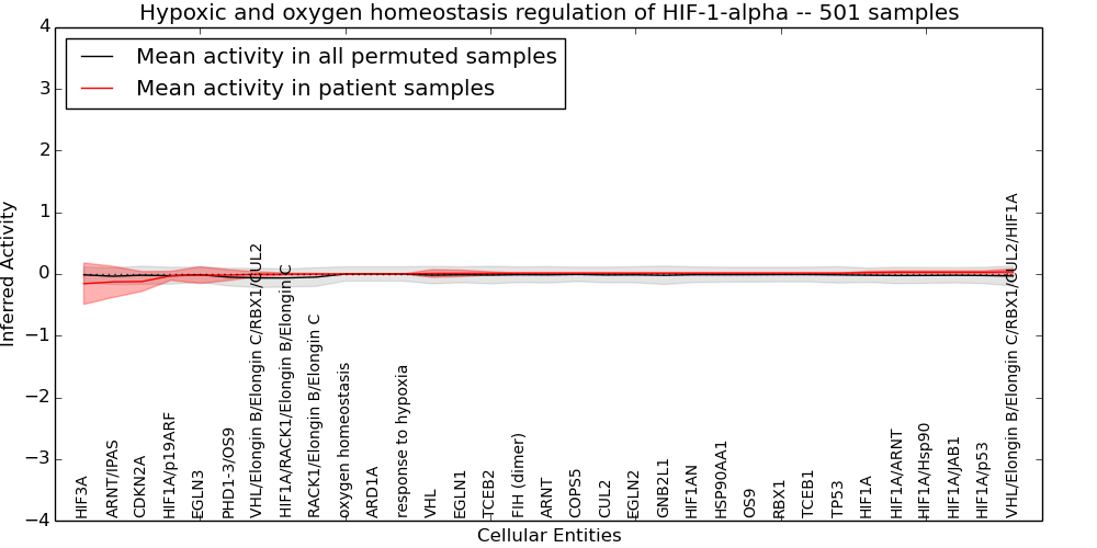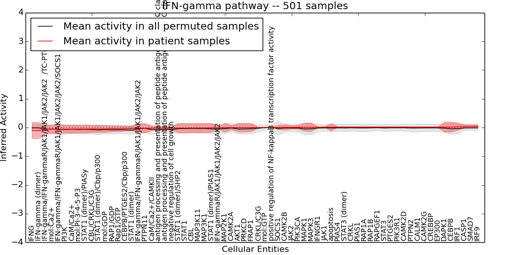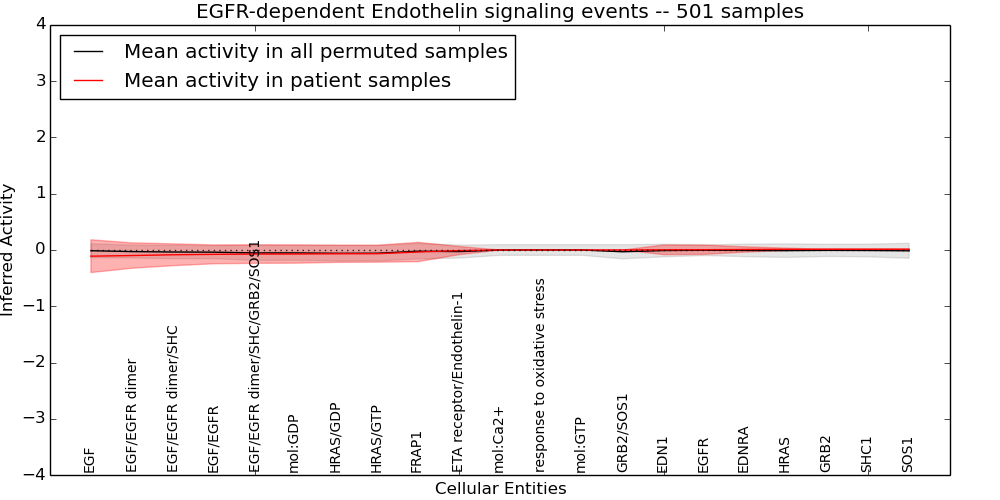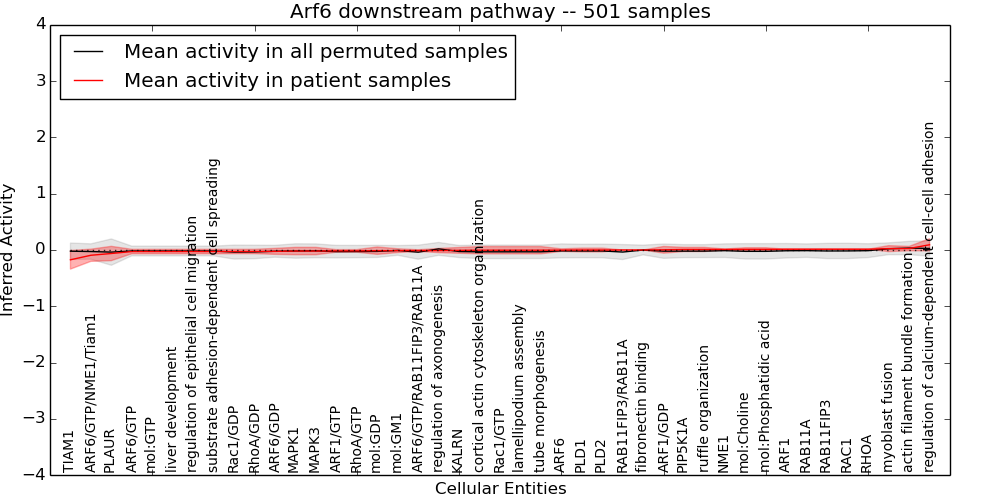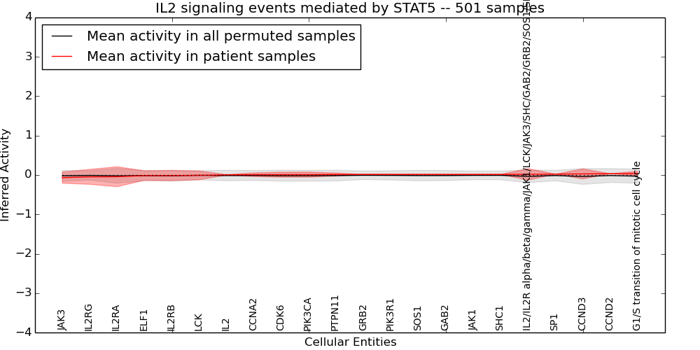Figure S131.  Get High-res Image This plot shows pathway concept perturbations across all samples against a permutation model. The concepts along the x-axis are sorted by lowest to highest mean activity for the real patient samples. Mean inferred activities are plotted along the y-axis as a colored band showing the average level and one standard deviation range. Real samples are shown in red and permuted samples in black.