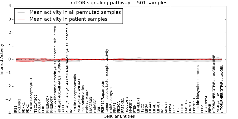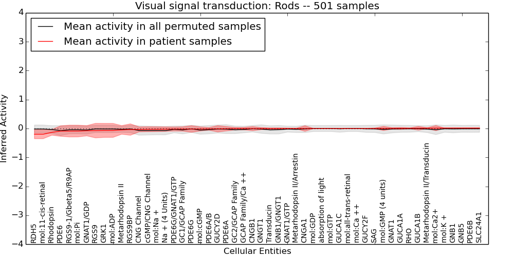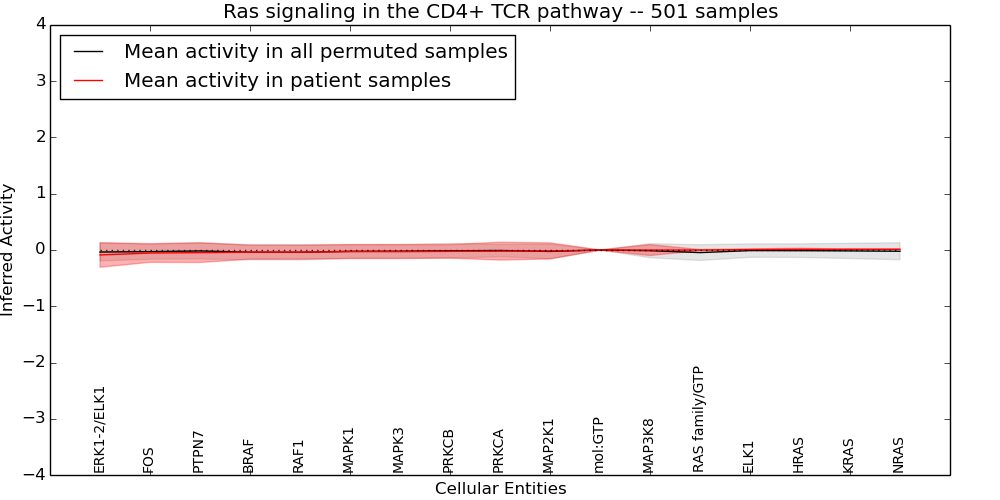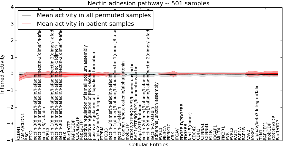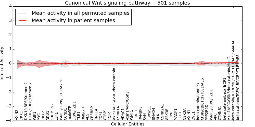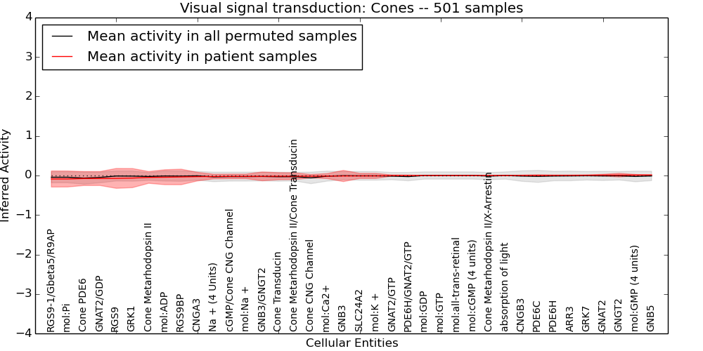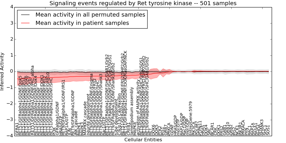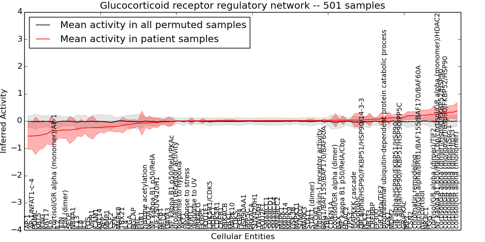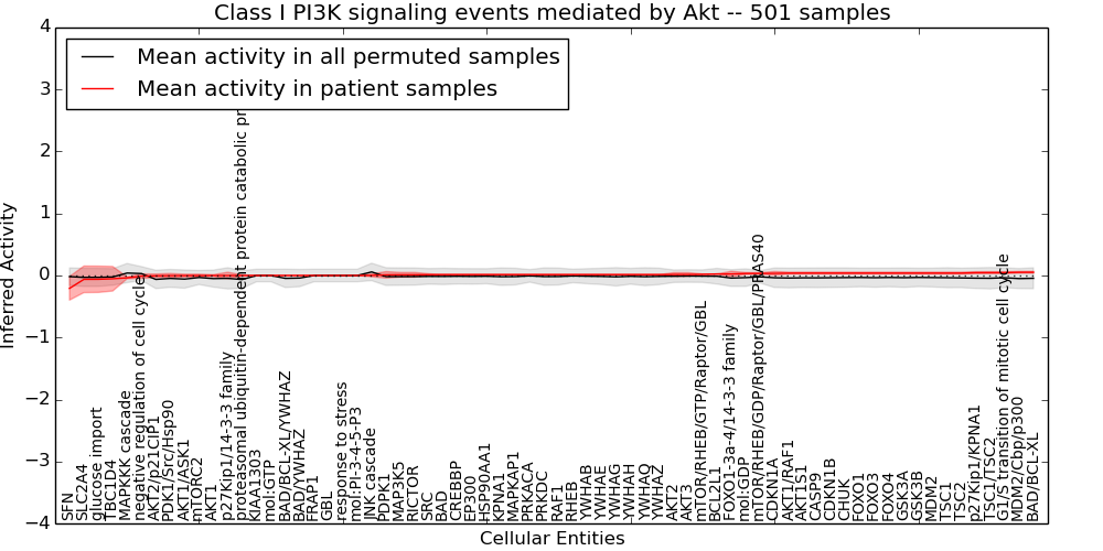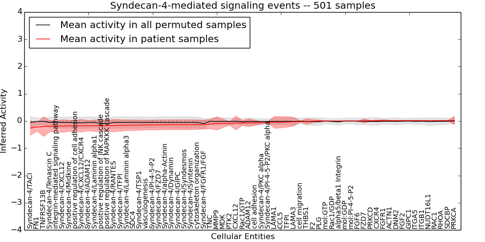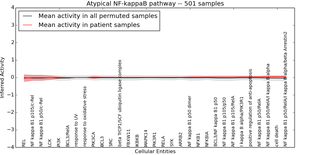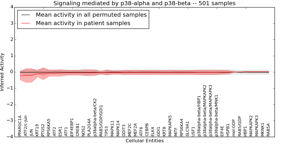 Figure S131.  Get High-res Image This plot shows pathway concept perturbations across all samples against a permutation model. The concepts along the x-axis are sorted by lowest to highest mean activity for the real patient samples. Mean inferred activities are plotted along the y-axis as a colored band showing the average level and one standard deviation range. Real samples are shown in red and permuted samples in black.