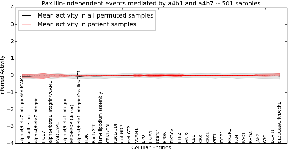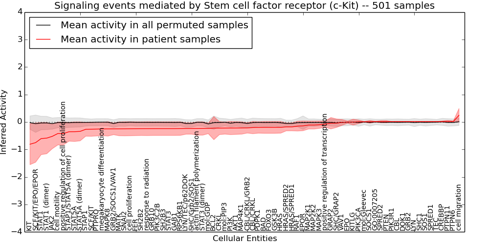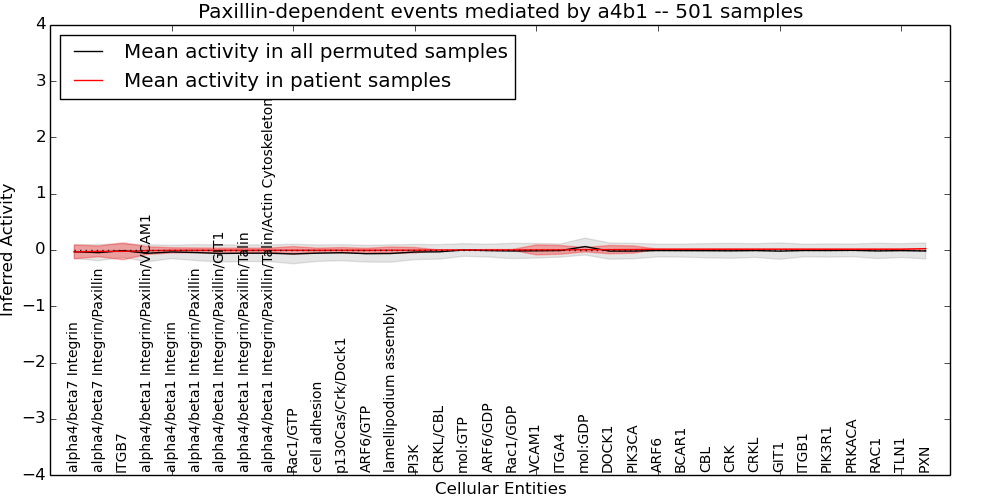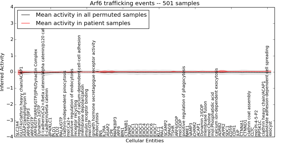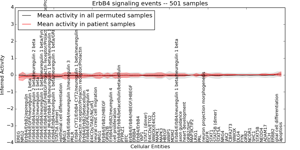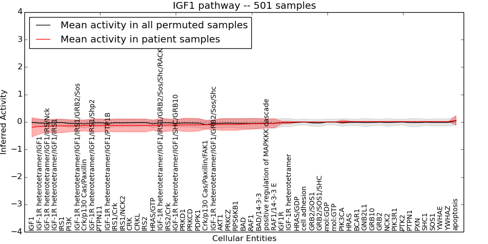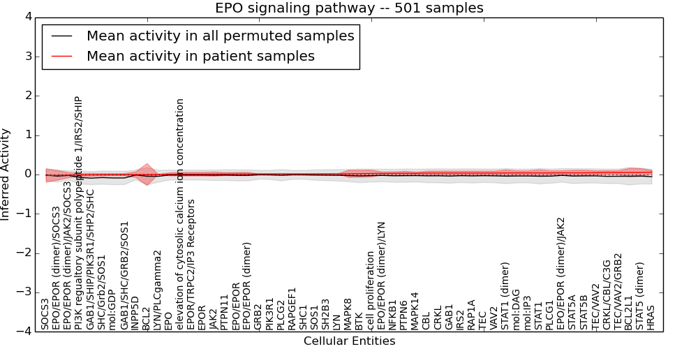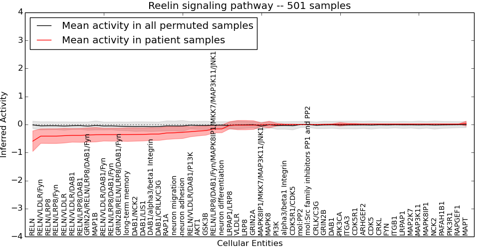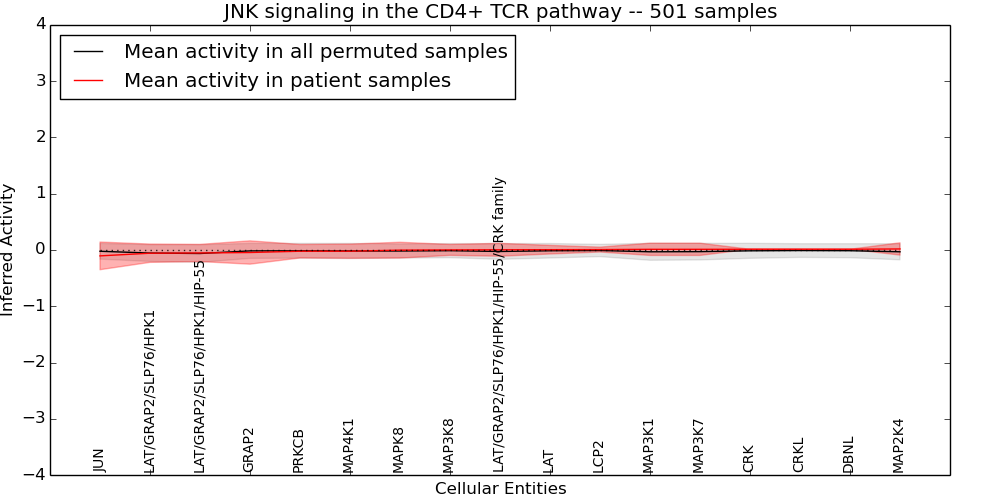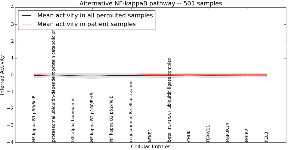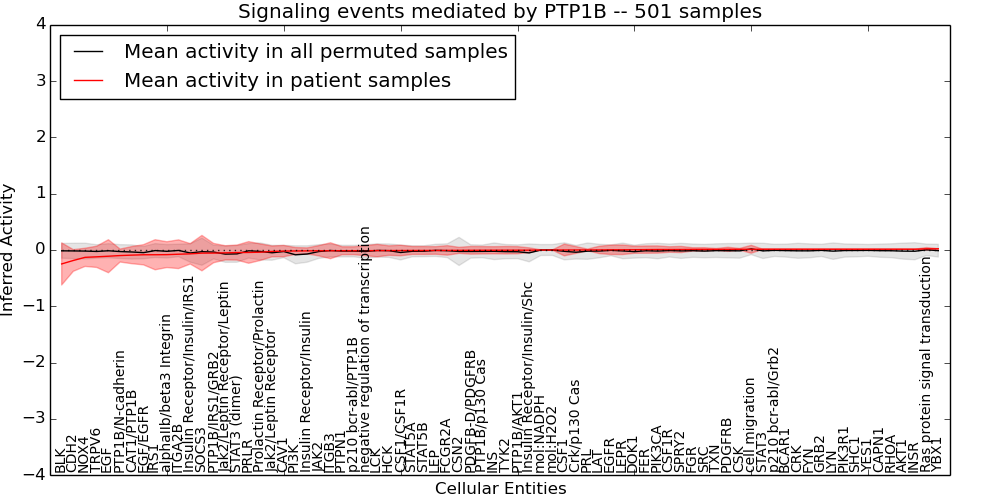 Figure S131.  Get High-res Image This plot shows pathway concept perturbations across all samples against a permutation model. The concepts along the x-axis are sorted by lowest to highest mean activity for the real patient samples. Mean inferred activities are plotted along the y-axis as a colored band showing the average level and one standard deviation range. Real samples are shown in red and permuted samples in black.
