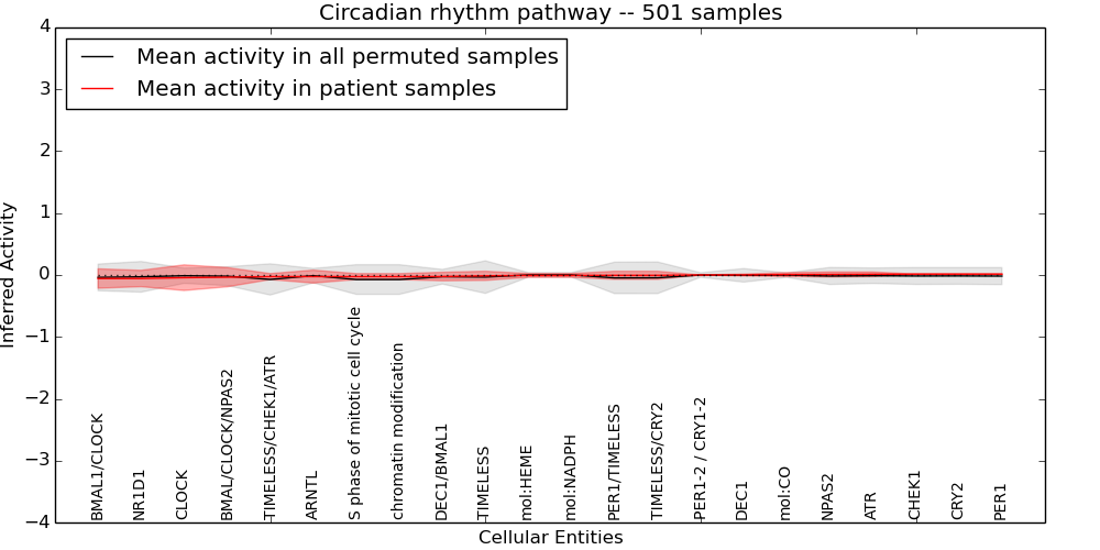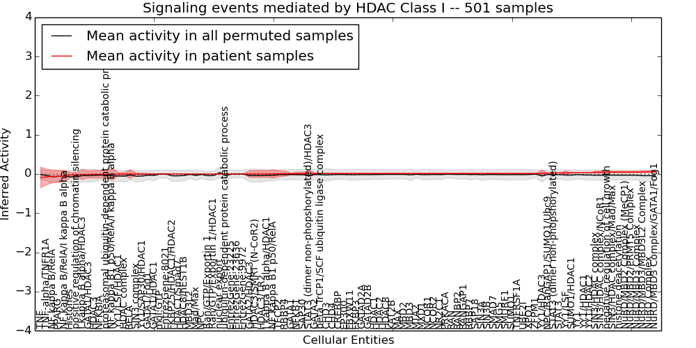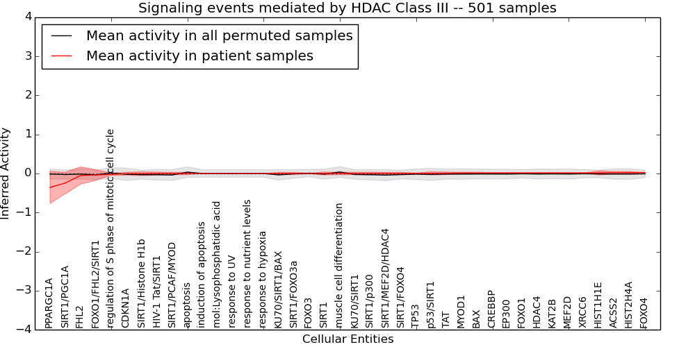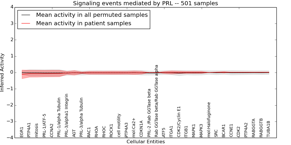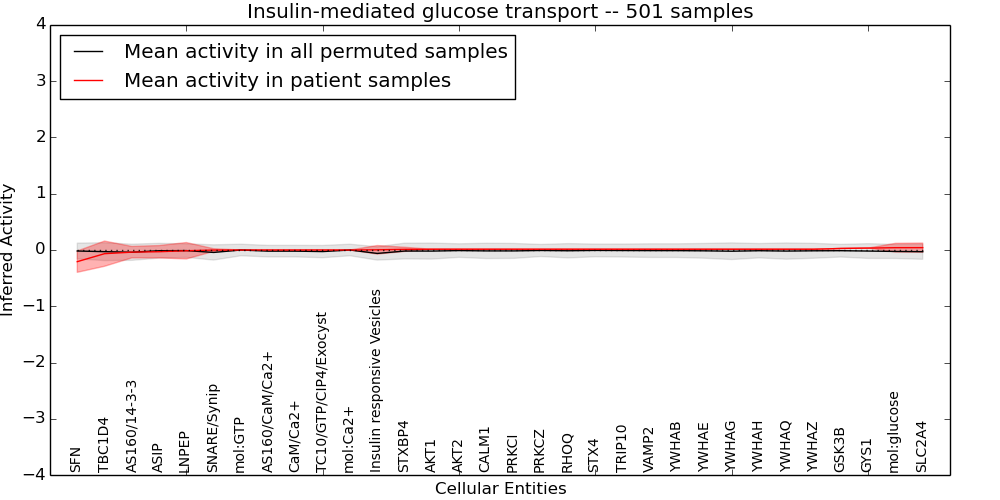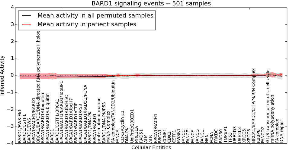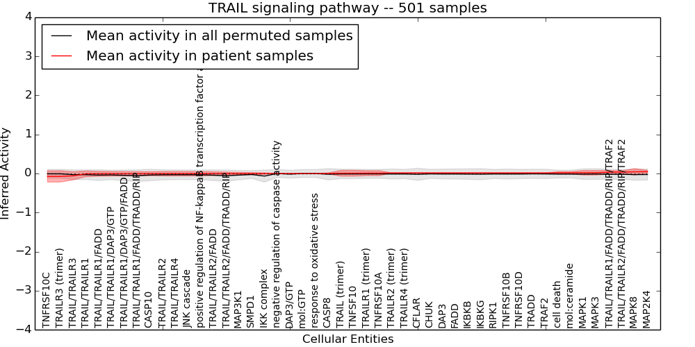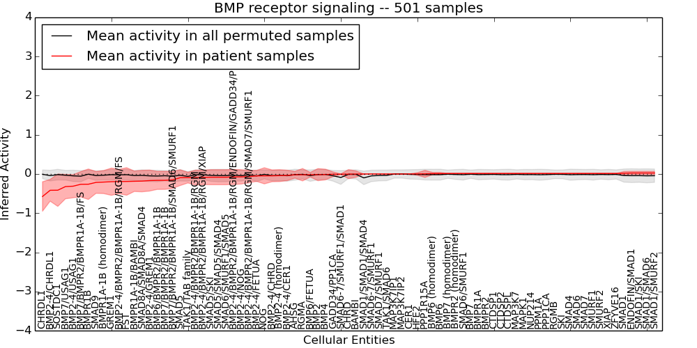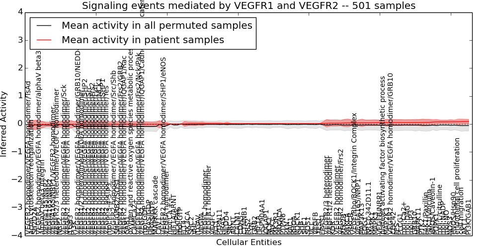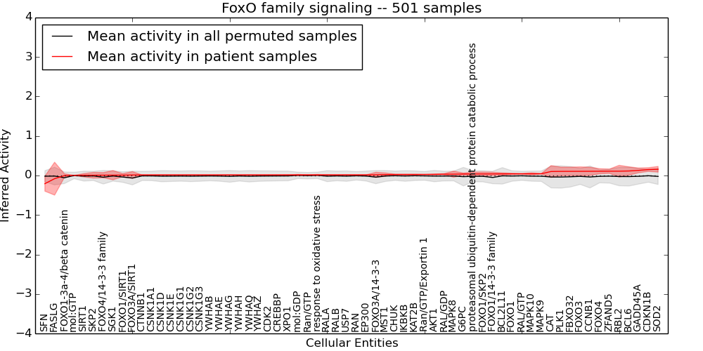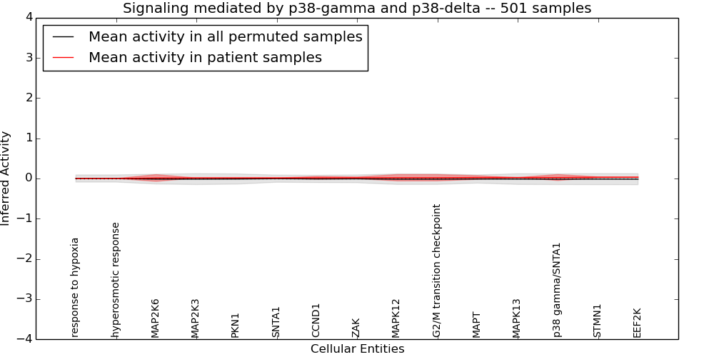Figure S131.  Get High-res Image This plot shows pathway concept perturbations across all samples against a permutation model. The concepts along the x-axis are sorted by lowest to highest mean activity for the real patient samples. Mean inferred activities are plotted along the y-axis as a colored band showing the average level and one standard deviation range. Real samples are shown in red and permuted samples in black.
