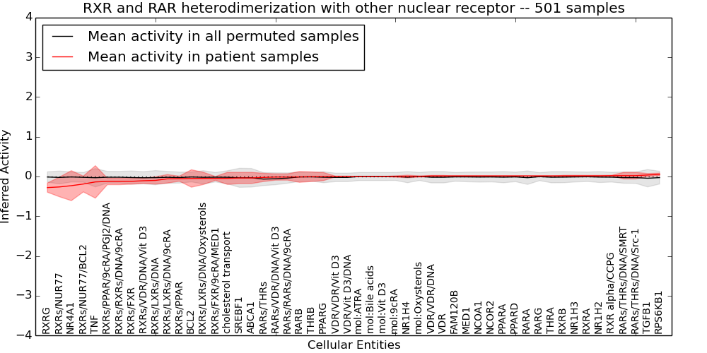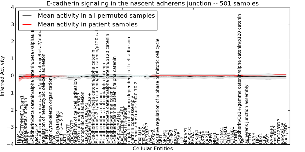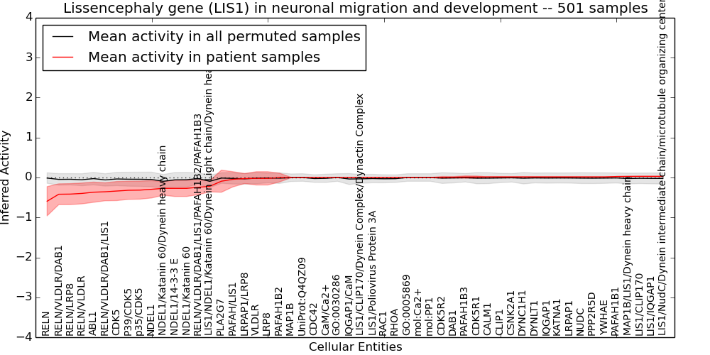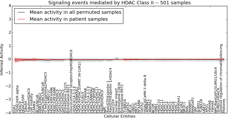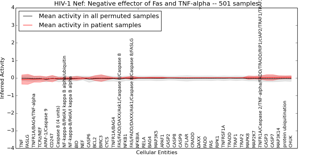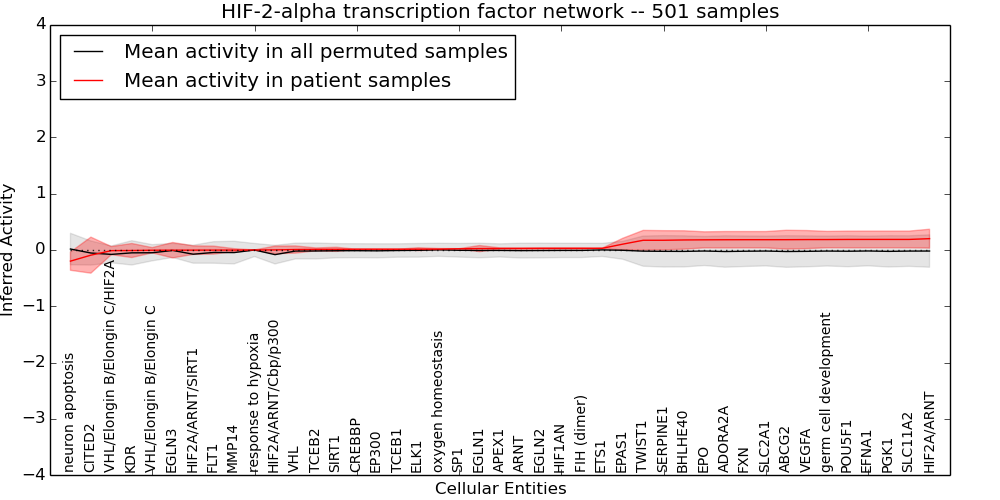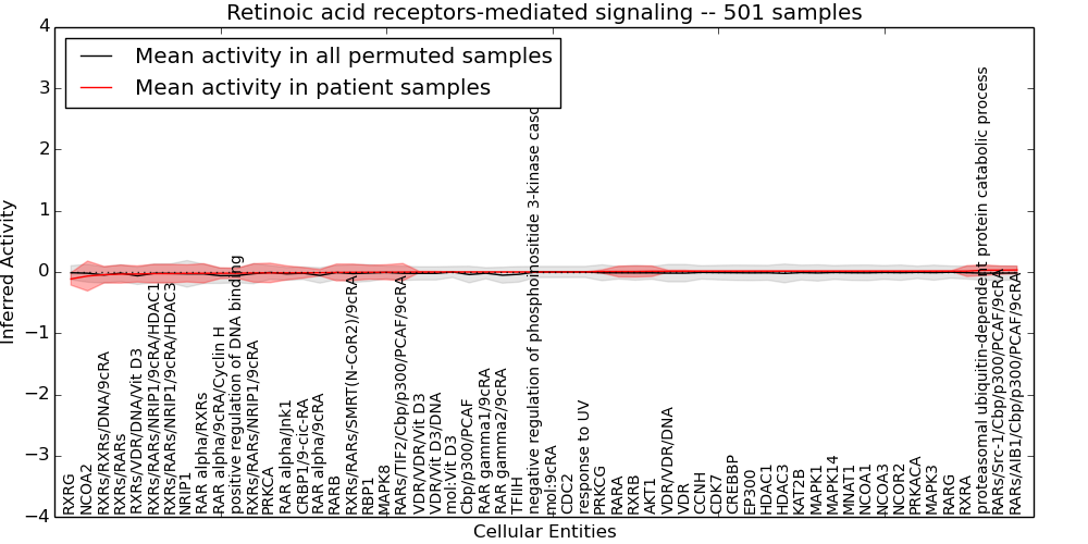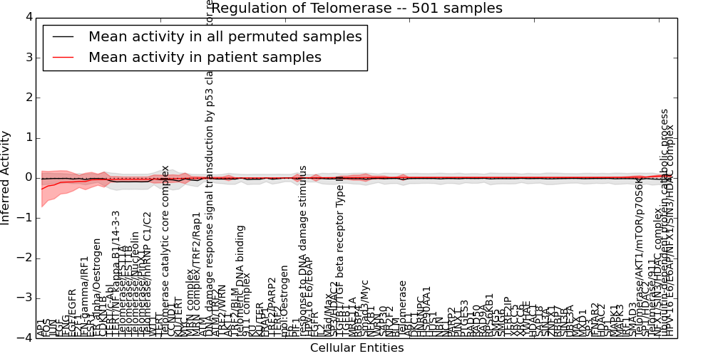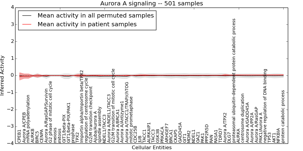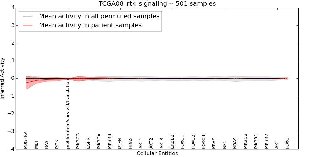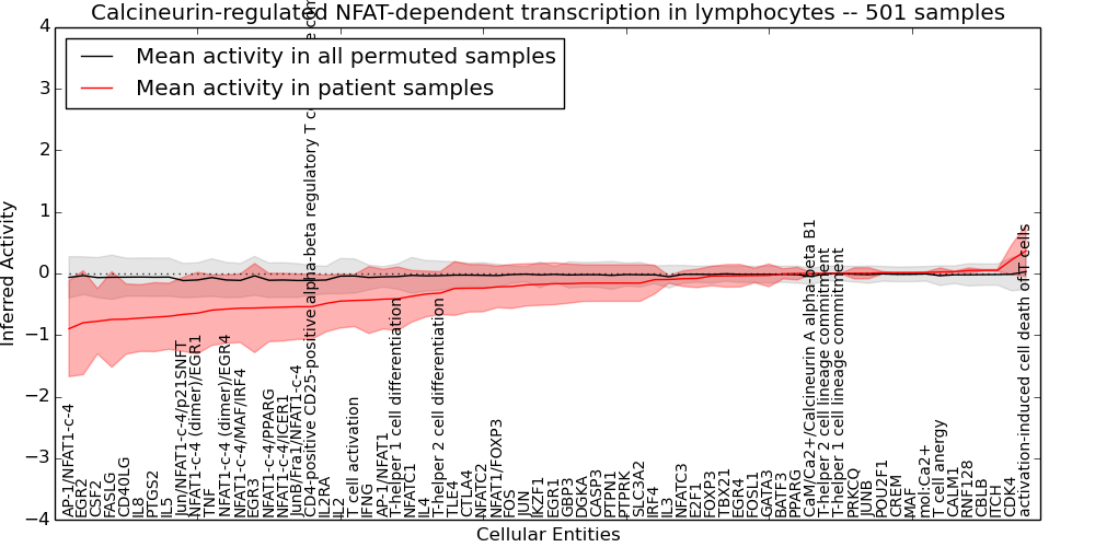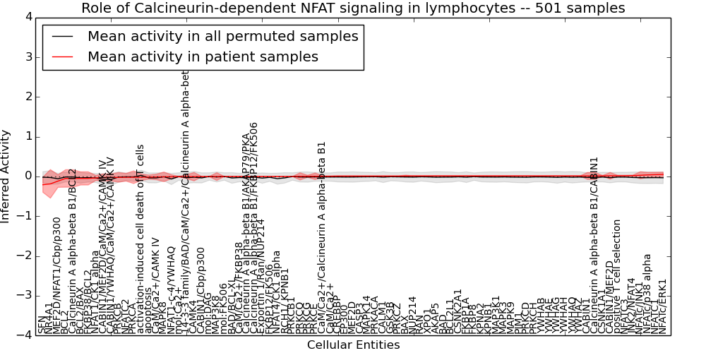 Figure S131.  Get High-res Image This plot shows pathway concept perturbations across all samples against a permutation model. The concepts along the x-axis are sorted by lowest to highest mean activity for the real patient samples. Mean inferred activities are plotted along the y-axis as a colored band showing the average level and one standard deviation range. Real samples are shown in red and permuted samples in black.