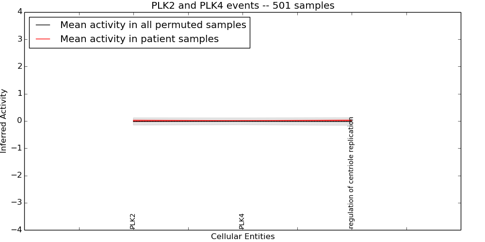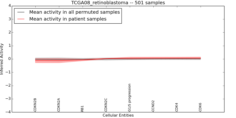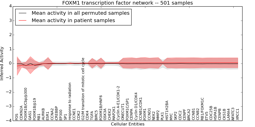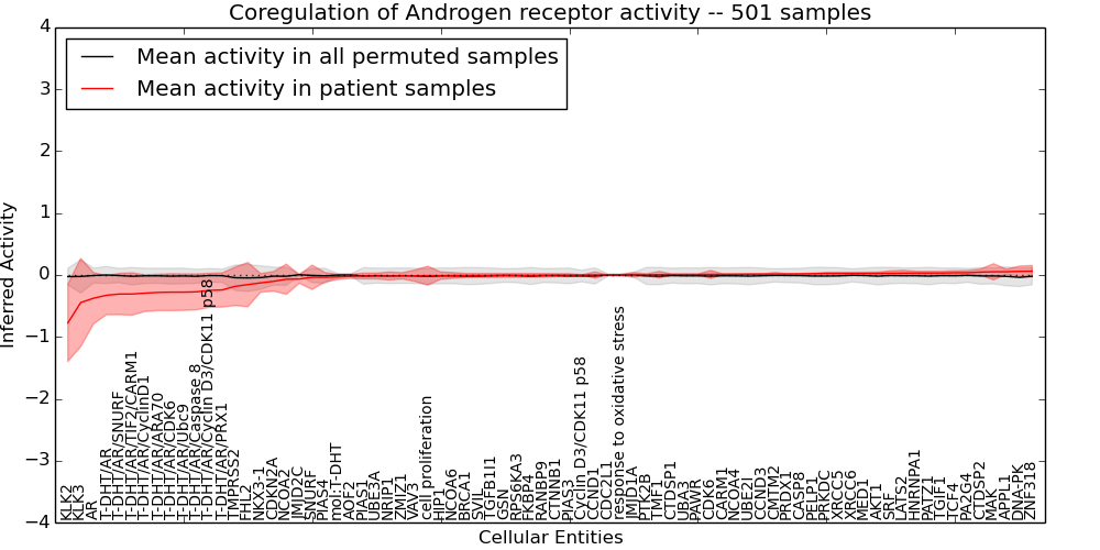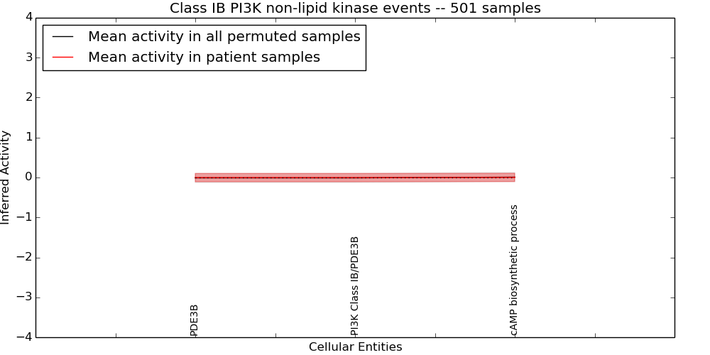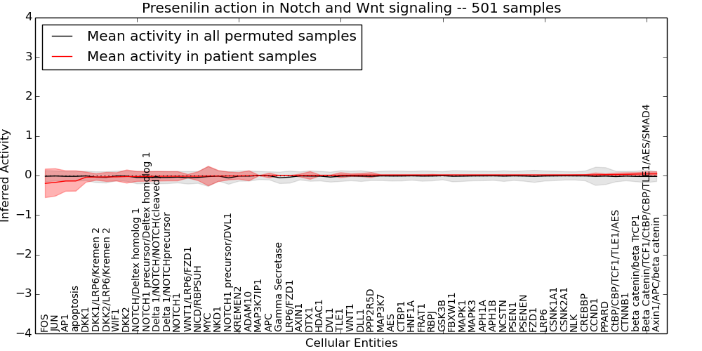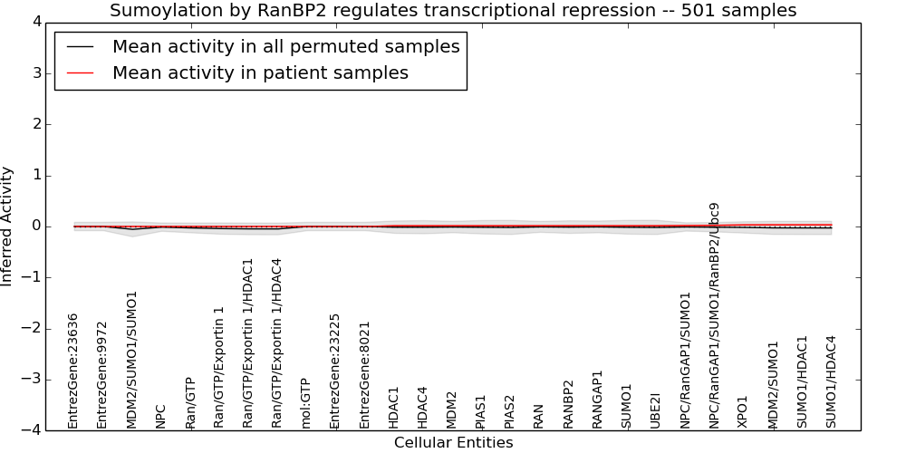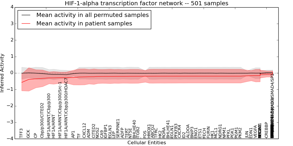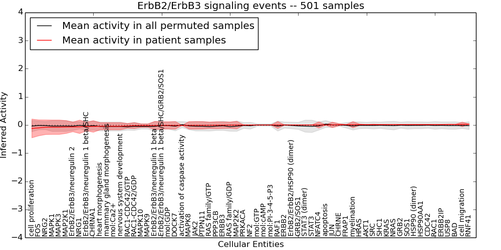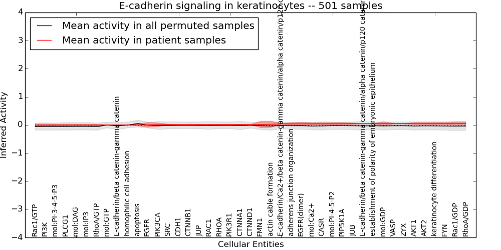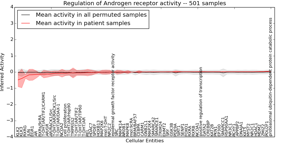 Figure S131.  Get High-res Image This plot shows pathway concept perturbations across all samples against a permutation model. The concepts along the x-axis are sorted by lowest to highest mean activity for the real patient samples. Mean inferred activities are plotted along the y-axis as a colored band showing the average level and one standard deviation range. Real samples are shown in red and permuted samples in black.