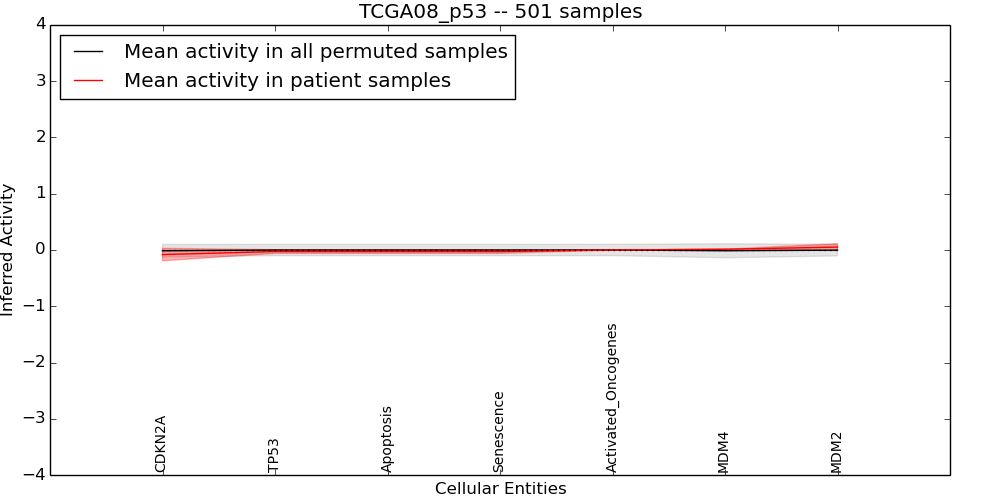 The significance of the IPL obtained for each concept in each patient sample is assessed using a permutation analysis. Importantly, the permutation analysis preserves data tuples so as to preserve any implicit correlations between the different data modalities. For example, genes that are deleted have concomitantly lower expression levels. Preserving the copy number and expression pairs therefore retains this data property. The simulation therefore makes "null samples" by permuting data tuples across all of the genes in the genome so that each gene in a null sample is associated with a random tuple of another gene with equal probability. This approach has the added benefit of preserving the pathway structure so that every observed IPL can be compared to a distribution of random IPLs derived from exactly the same interaction context. PARADIGM inferences are then obtained for 1000 "null" patients and serve as a background distribution to contrast the observed IPLs against. Pathway concepts are excluded from further analysis if they did not obtain a minimum IPL of 0.5 in any patient sample both observed or simulated.