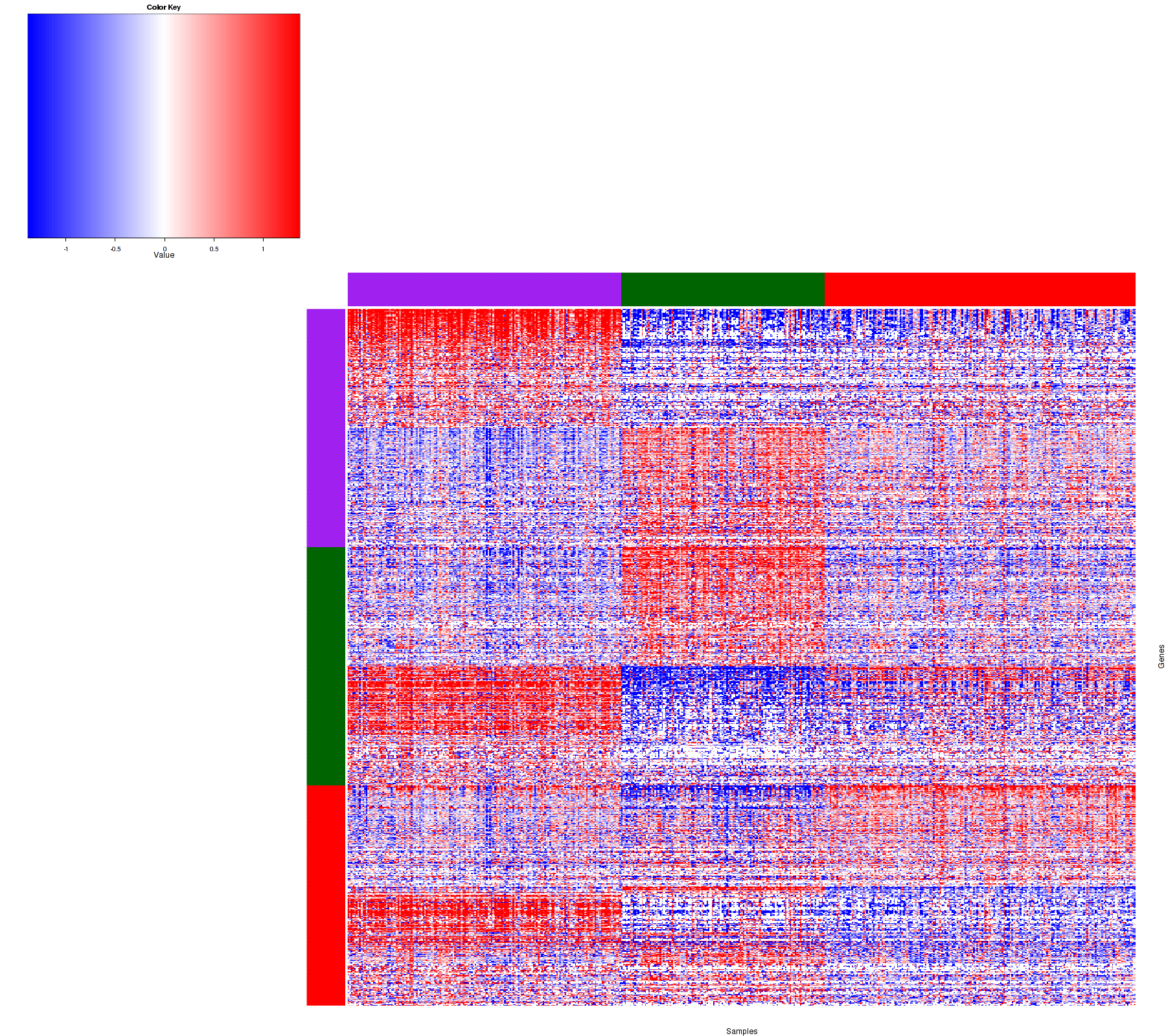Figure 1. Get High-res Image Samples were separated into 3 clusters. Shown are 472 samples and 878 marker miRs. The color bar of the row indicates the marker miRs for the corresponding cluster.