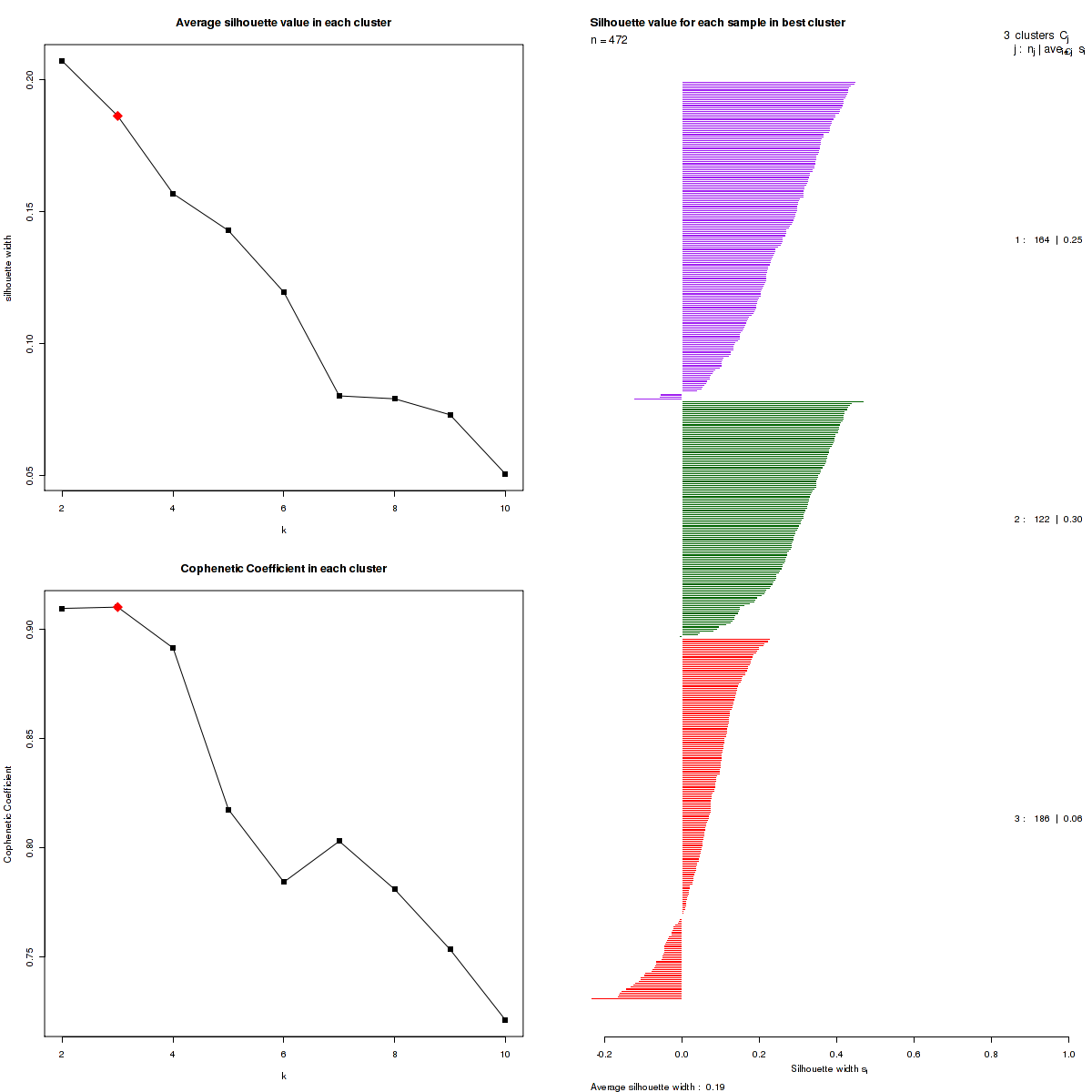 The cophenetic correlation coefficients and average silhouette values are used to determine the k with the most robust clusterings. From the plot of cophenetic correlation versus k, we select modes and the the point preceding the greatest decrease in cophenetic correlation coefficient, and from these choose the k with the highest average silhouette value.