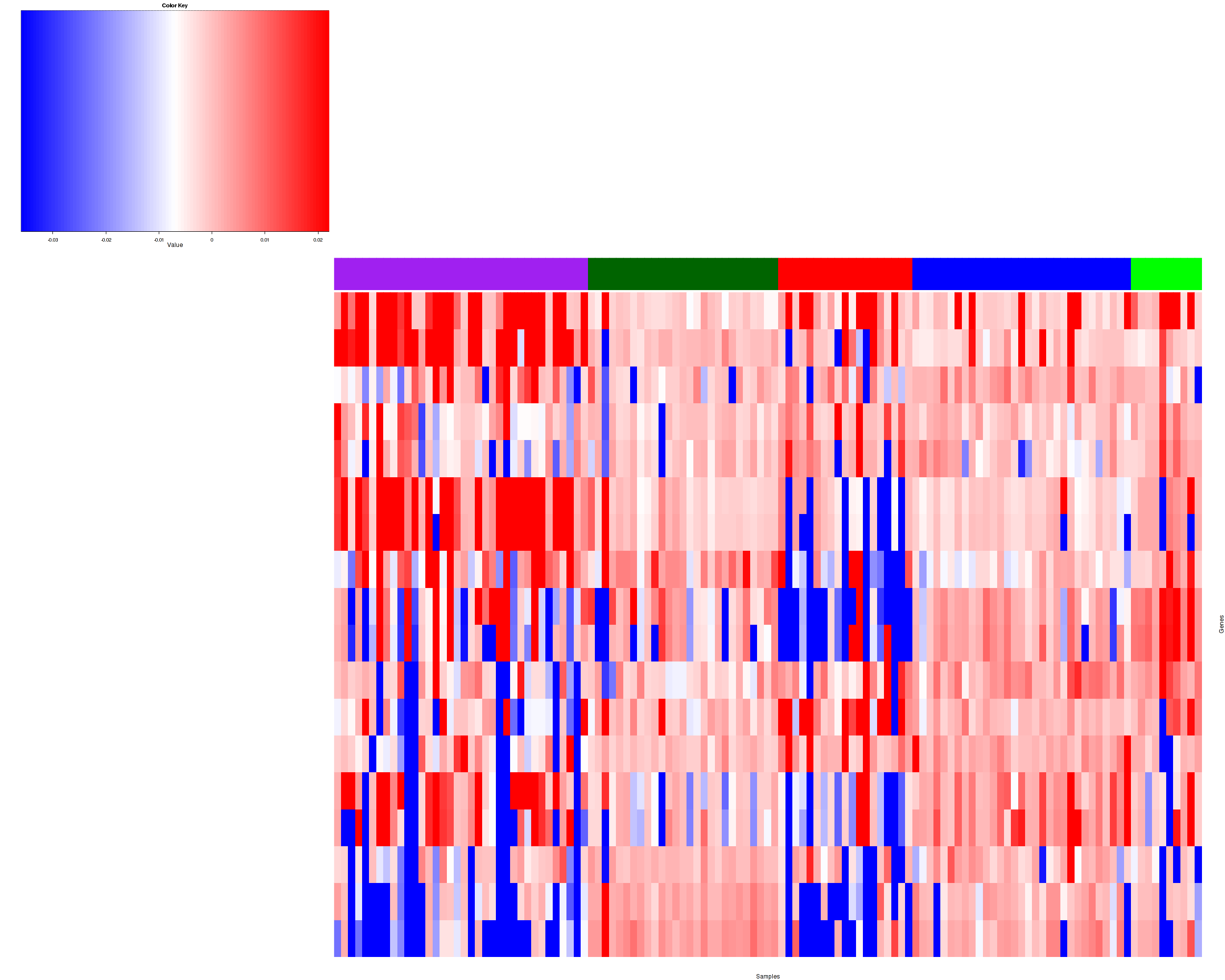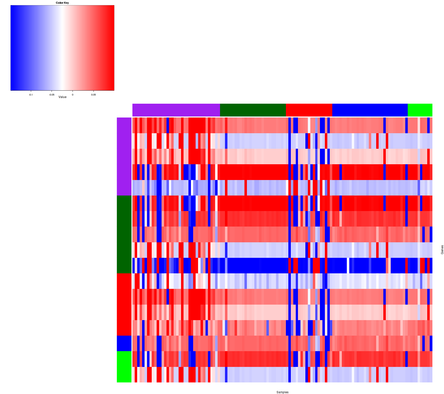 Figure 1. Get High-res Image Samples were separated into 5 clusters. Shown are 123 samples and 17 marker focal events. The color bar of the row indicates the marker focal events for the corresponding cluster.