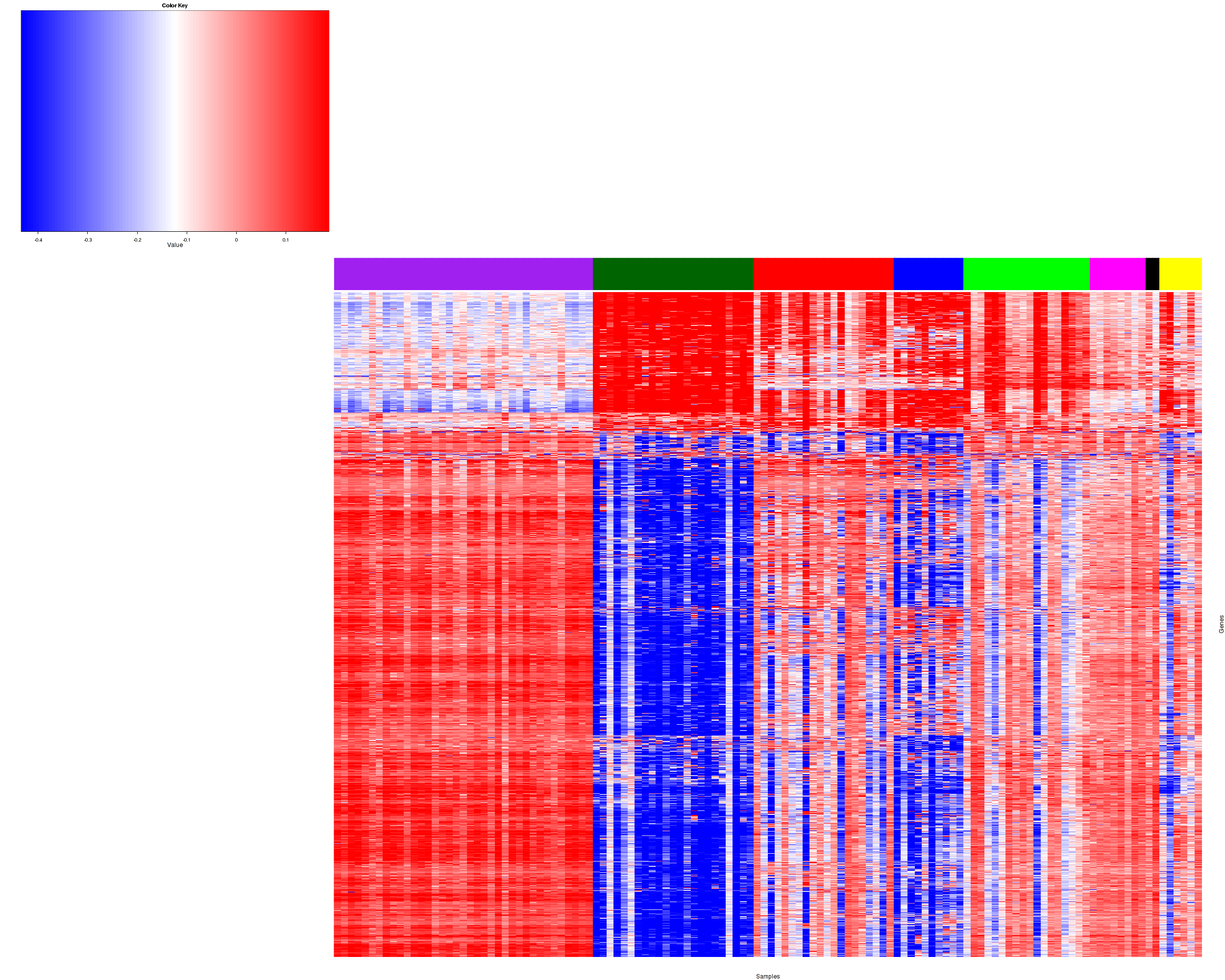 Figure 1. Get High-res Image Samples were separated into 8 clusters. Shown are 124 samples and 1456 marker genes. The color bar of the row indicates the marker genes for the corresponding cluster.