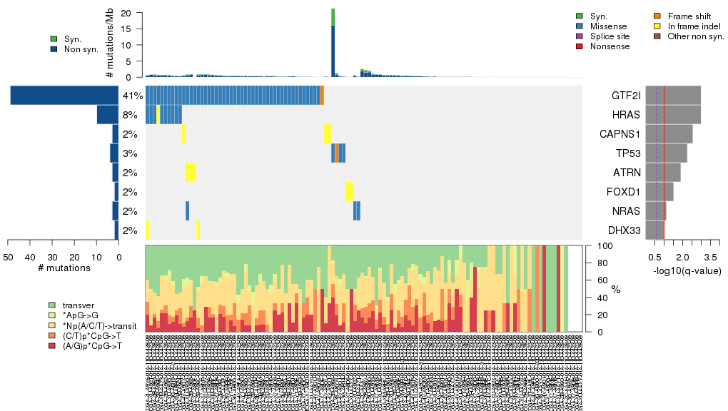 Figure 3. Get High-res Image The matrix in the center of the figure represents individual mutations in patient samples, color-coded by type of mutation, for the significantly mutated genes. The rate of synonymous and non-synonymous mutations is displayed at the top of the matrix. The barplot on the left of the matrix shows the number of mutations in each gene. The percentages represent the fraction of tumors with at least one mutation in the specified gene. The barplot to the right of the matrix displays the q-values for the most significantly mutated genes. The purple boxplots below the matrix (only displayed if required columns are present in the provided MAF) represent the distributions of allelic fractions observed in each sample. The plot at the bottom represents the base substitution distribution of individual samples, using the same categories that were used to calculate significance.