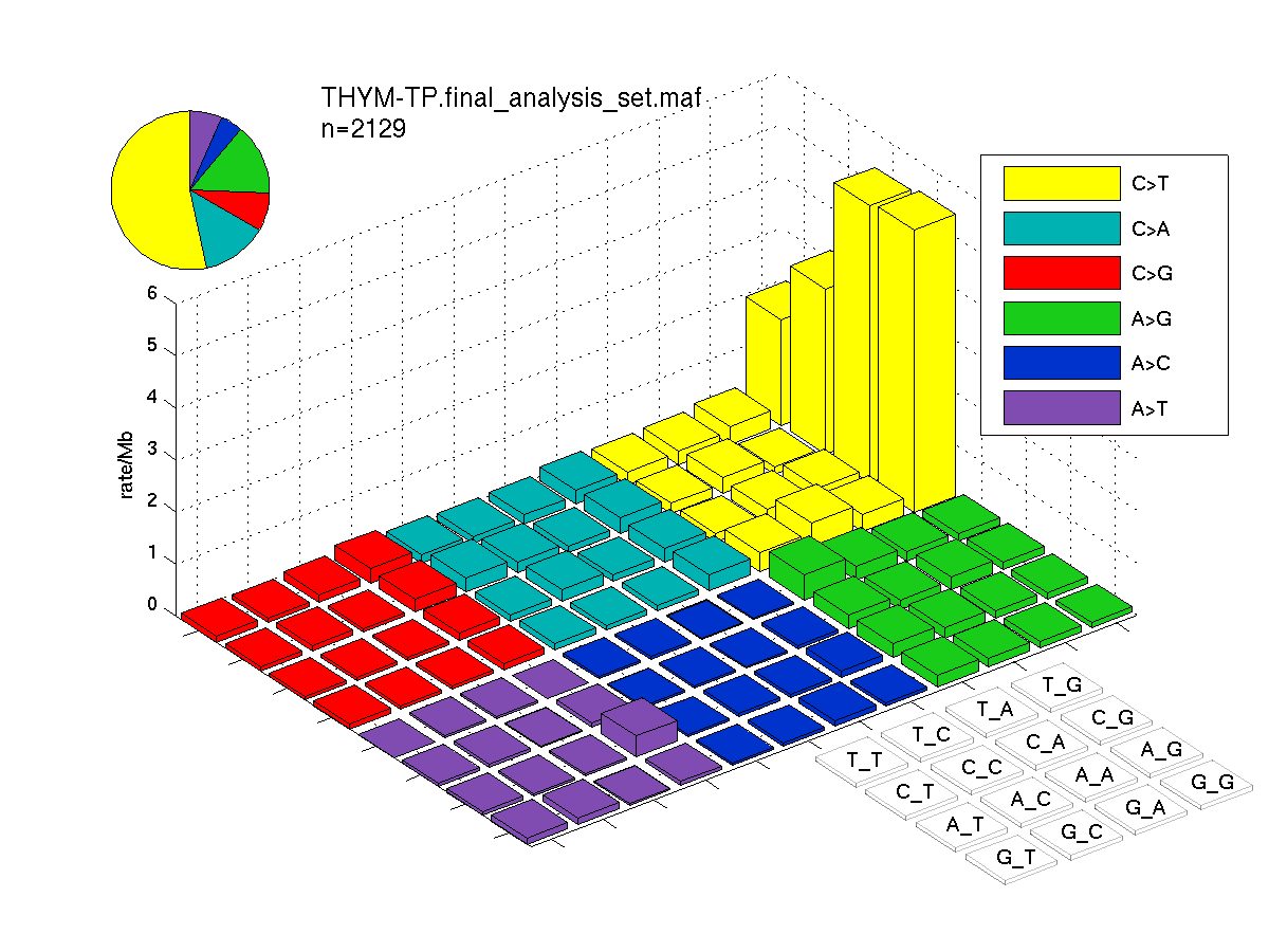The mutation spectrum is depicted in the lego plots below in which the 96 possible mutation types are subdivided into six large blocks, color-coded to reflect the base substitution type. Each large block is further subdivided into the 16 possible pairs of 5' and 3' neighbors, as listed in the 4x4 trinucleotide context legend. The height of each block corresponds to the mutation frequency for that kind of mutation (counts of mutations normalized by the base coverage in a given bin). The shape of the spectrum is a signature for dominant mutational mechanisms in different tumor types.
