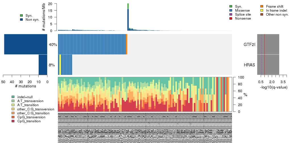 Figure 5. Get High-res Image The matrix in the center of the figure represents individual mutations in patient samples, color-coded by type of mutation, for the significantly mutated genes. The rate of synonymous and non-synonymous mutations is displayed at the top of the matrix. The barplot on the left of the matrix shows the number of mutations in each gene. The percentages represent the fraction of tumors with at least one mutation in the specified gene. The barplot to the right of the matrix displays the q-values for the most significantly mutated genes. The purple boxplots below the matrix (only displayed if required columns are present in the provided MAF) represent the distributions of allelic fractions observed in each sample. The plot at the bottom represents the base substitution distribution of individual samples, using the same categories that were used to calculate significance.