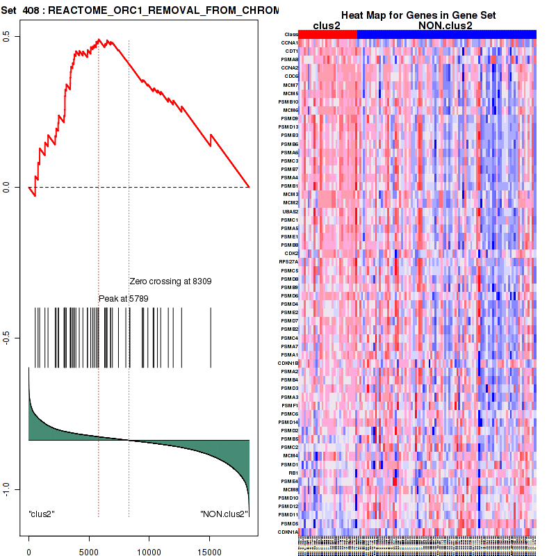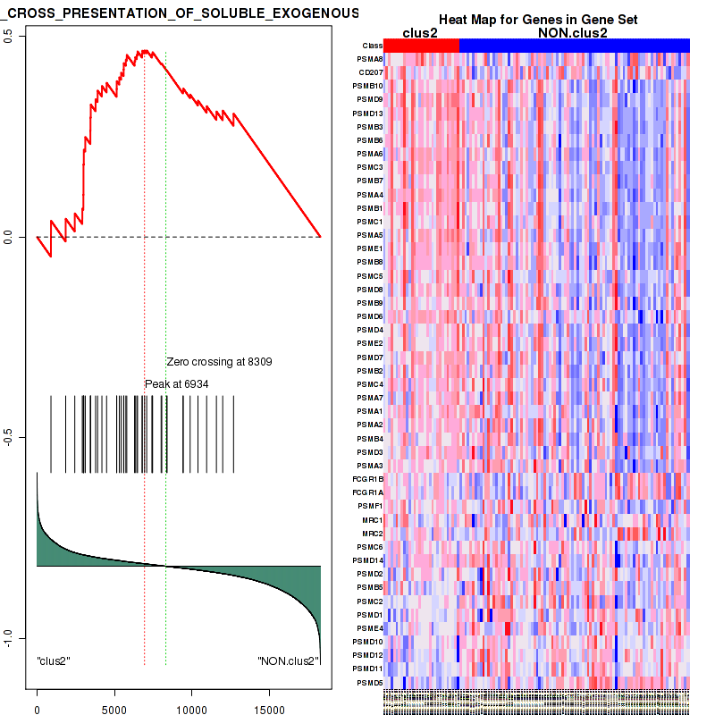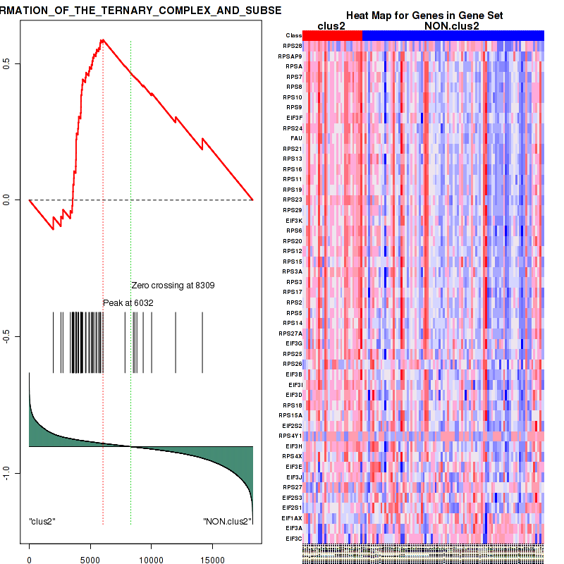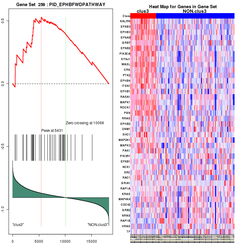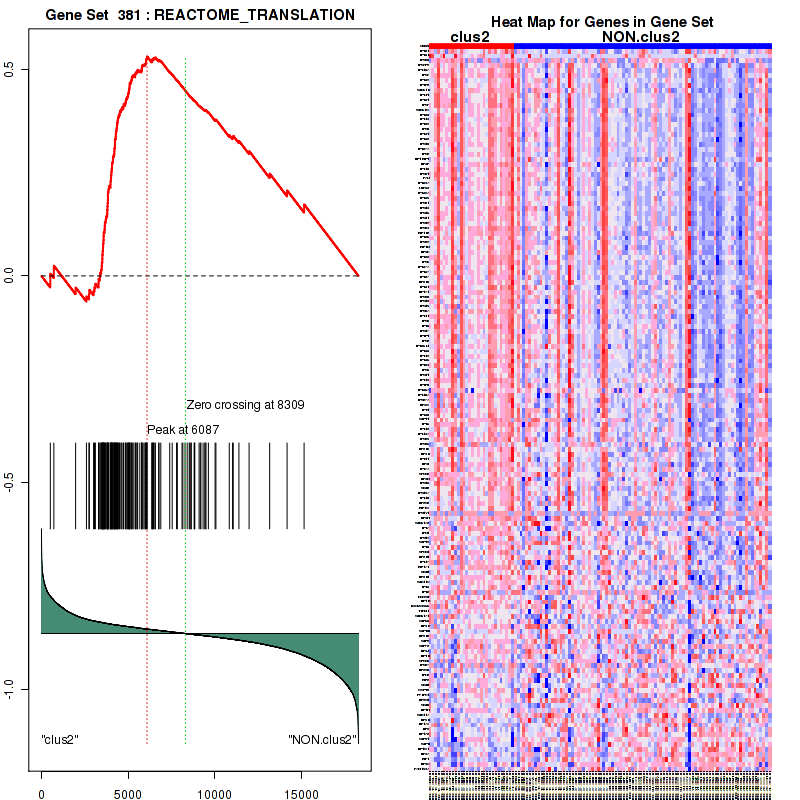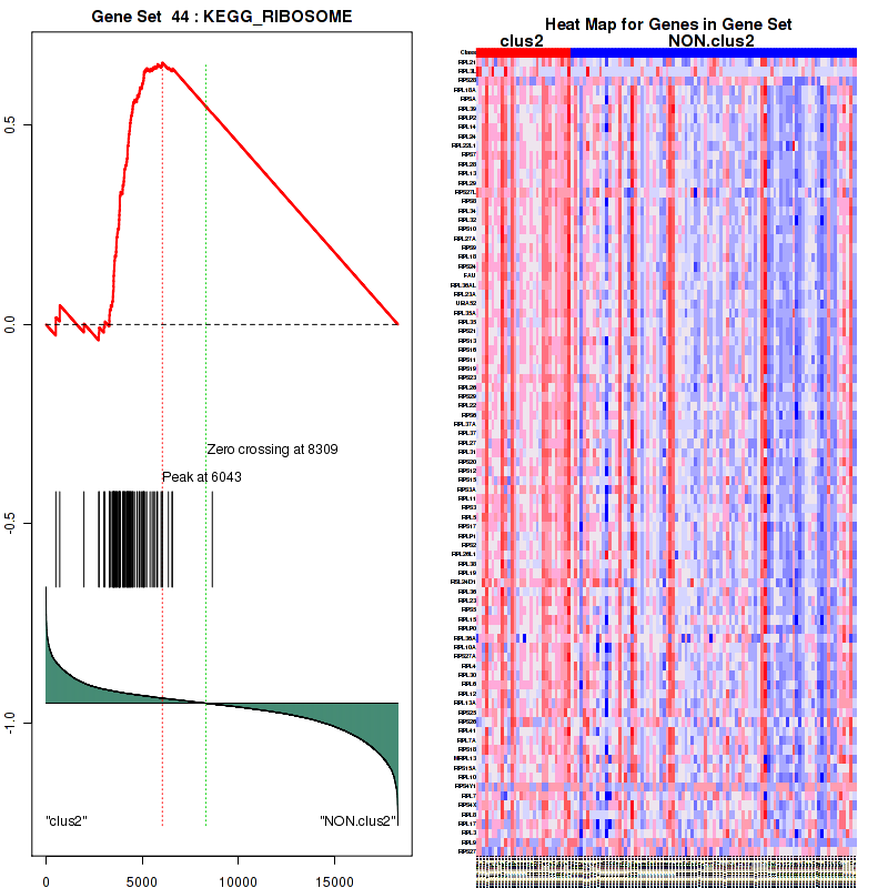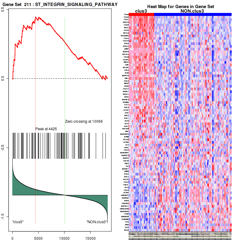 Table S1. Get Full Table This table shows a Running Enrichment Score (RES) of each gene in this pathway, that is, the enrichment score at this point in the ranked list of genes. All genes are ranked by Signal-to-Noise (S2N), a measure of similarity as default and are used to obtain ES matrix of all genes. In this way, GSEA tool uses expression pattern of not only overlapped genes but also not-overlapped genes to produce ES matrix.