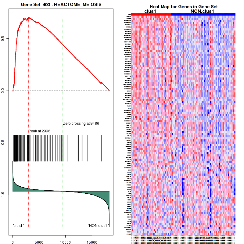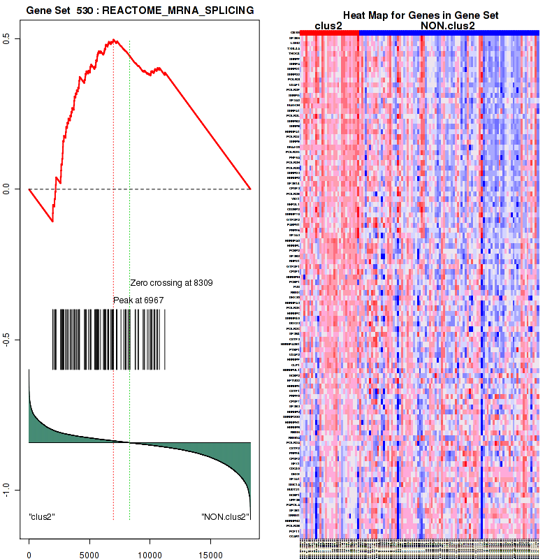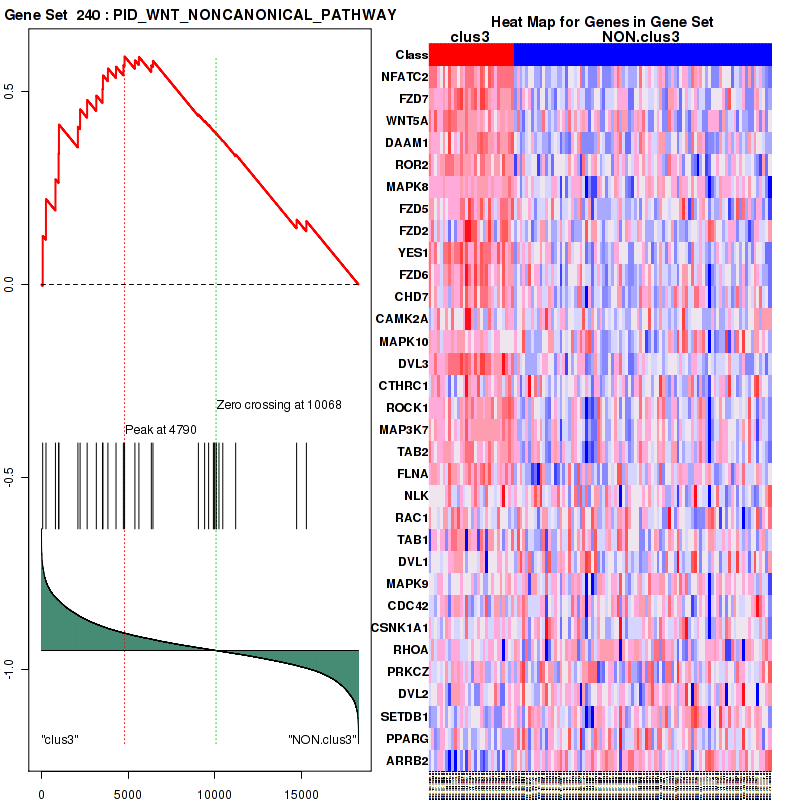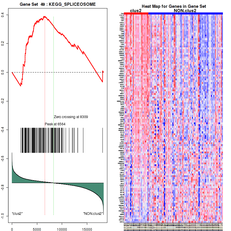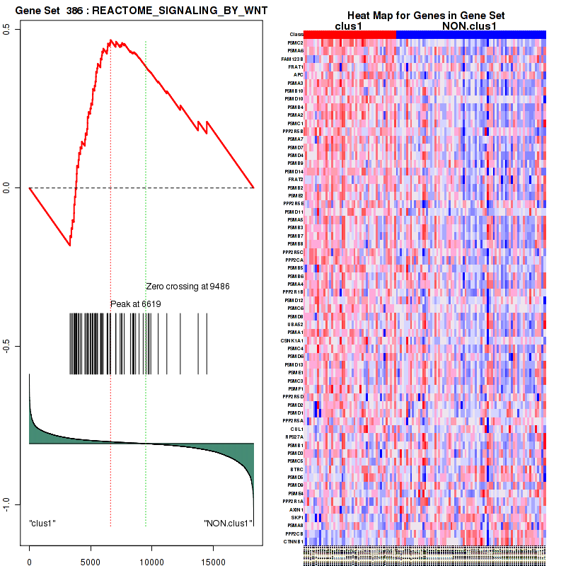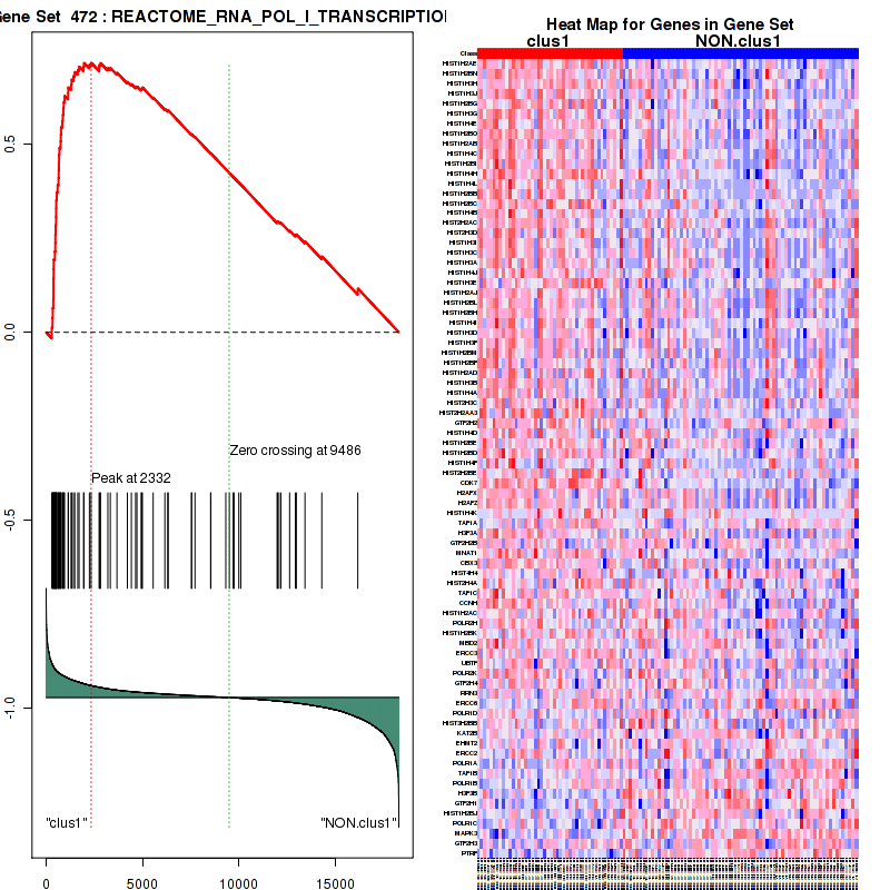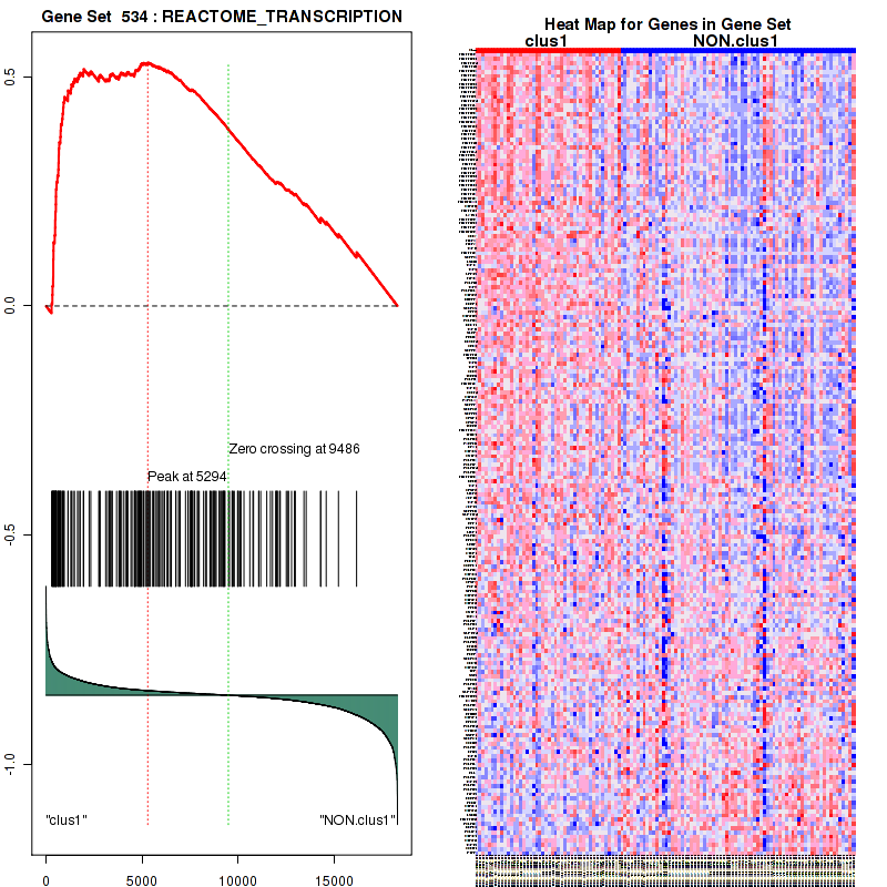 Table S1. Get Full Table This table shows a Running Enrichment Score (RES) of each gene in this pathway, that is, the enrichment score at this point in the ranked list of genes. All genes are ranked by Signal-to-Noise (S2N), a measure of similarity as default and are used to obtain ES matrix of all genes. In this way, GSEA tool uses expression pattern of not only overlapped genes but also not-overlapped genes to produce ES matrix.