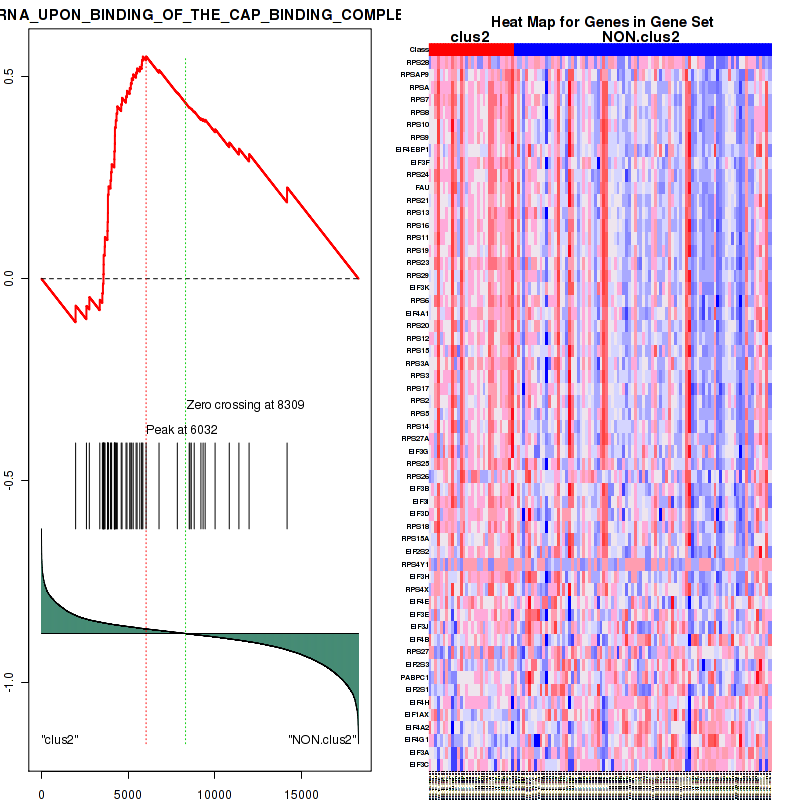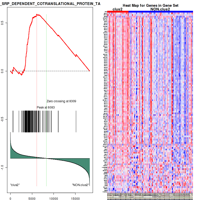 Top enriched gene sets are KEGG RIBOSOME, KEGG SPLICEOSOME, REACTOME TRANSLATION, REACTOME FORMATION OF THE TERNARY COMPLEX AND SUBSEQUENTLY THE 43S COMPLEX, REACTOME CROSS PRESENTATION OF SOLUBLE EXOGENOUS ANTIGENS ENDOSOMES, REACTOME ORC1 REMOVAL FROM CHROMATIN, REACTOME SRP DEPENDENT COTRANSLATIONAL PROTEIN TARGETING TO MEMBRANE, REACTOME ACTIVATION OF THE MRNA UPON BINDING OF THE CAP BINDING COMPLEX AND EIFS AND SUBSEQUENT BINDING TO 43S, REACTOME PEPTIDE CHAIN ELONGATION, REACTOME MRNA SPLICING